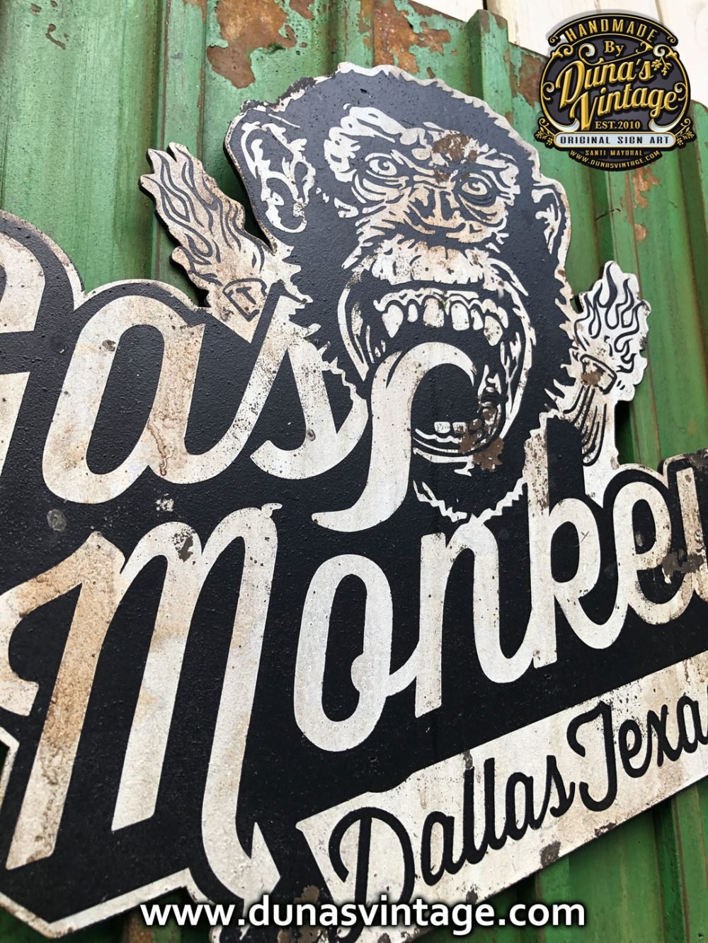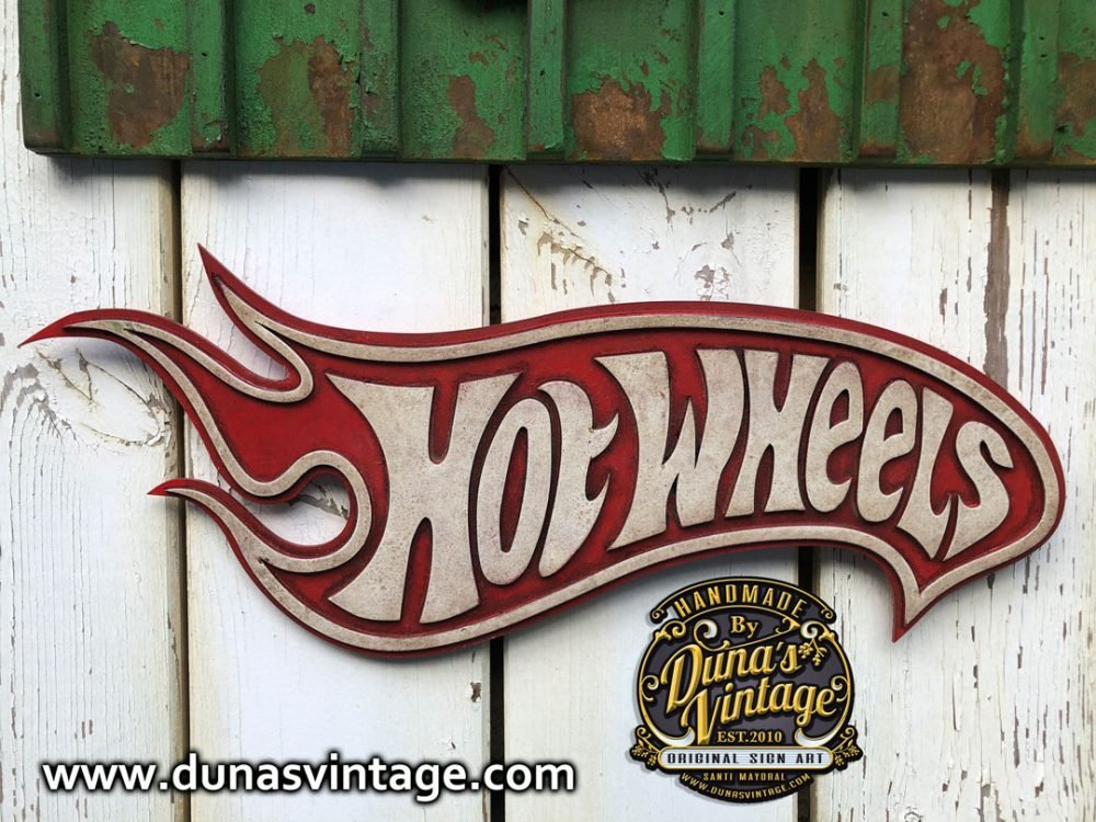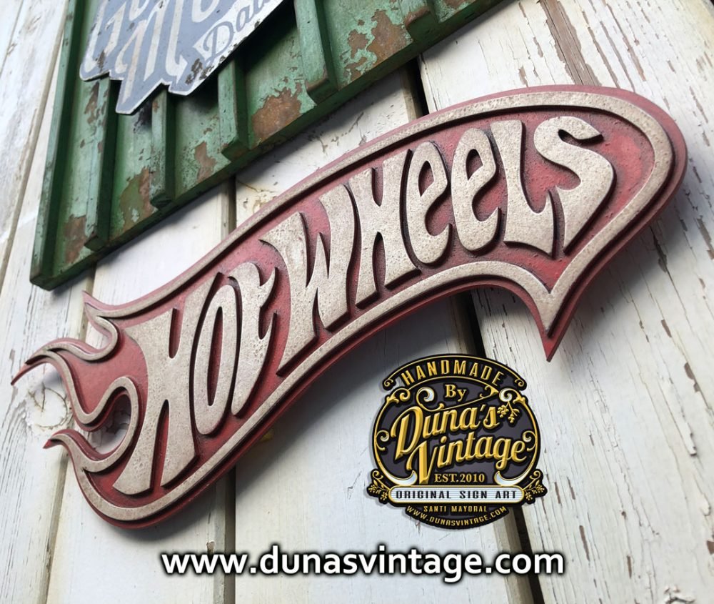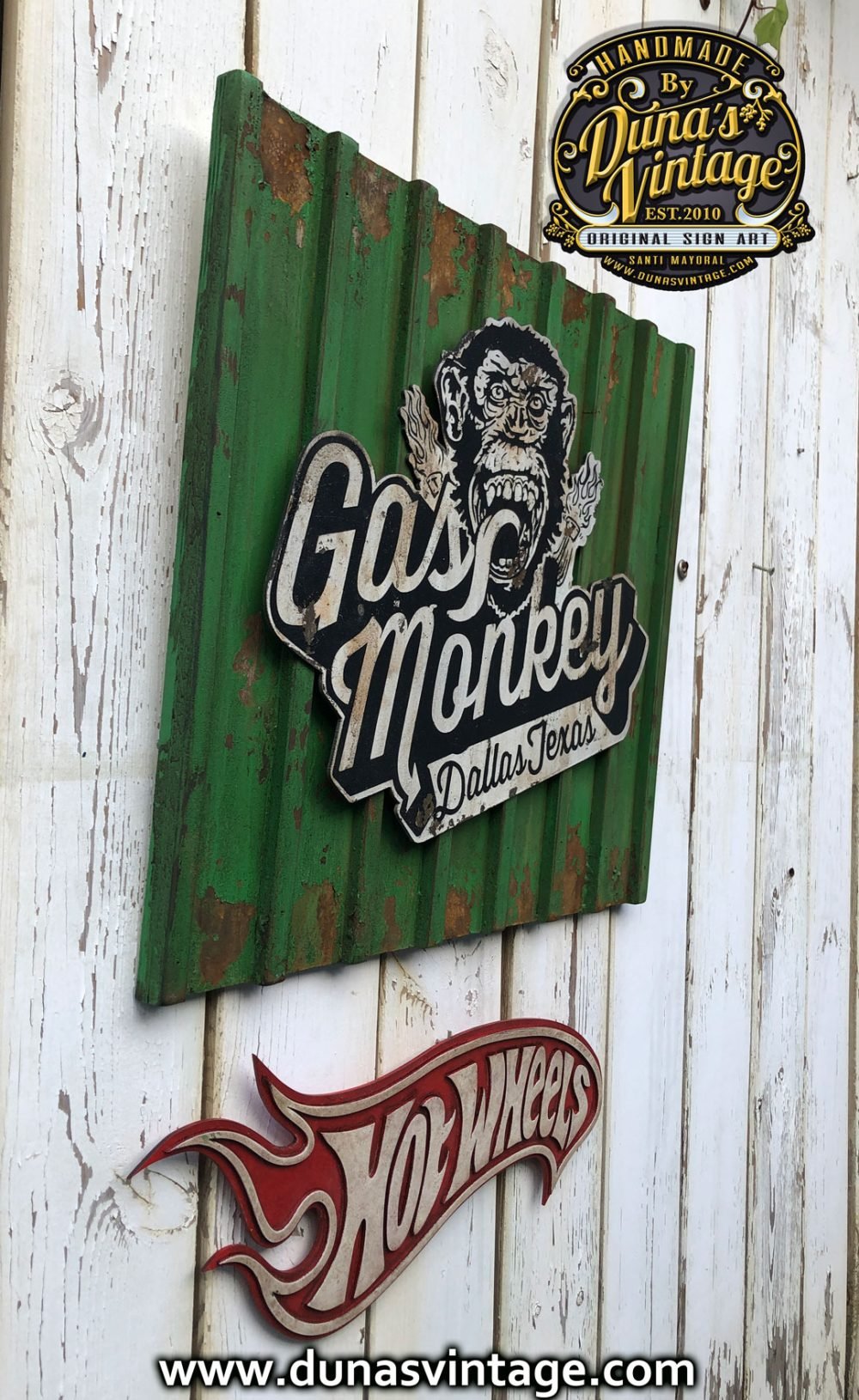 Encargo para Frederic del norte (Francia) Cartel de Gas Monkey tamaño 50x55cm trabajado en madera y con efecto oxido de la marca Owatrol y toques envejecido Vintage, Cartel Hot Wheels tamaño 50×18,5cm trabajado en madera cortado a laser y efecto envejecido Vintage.