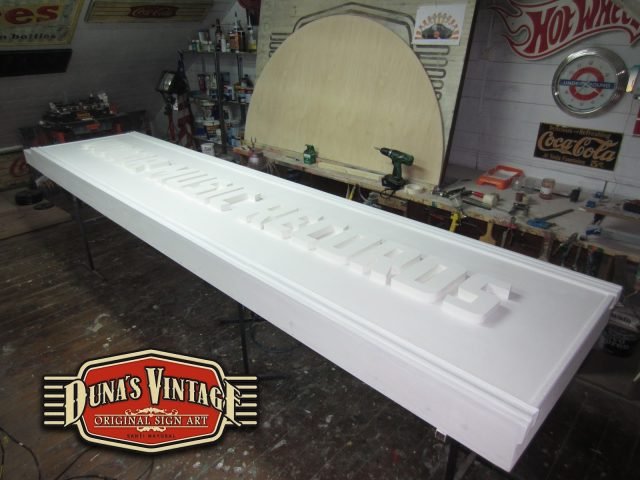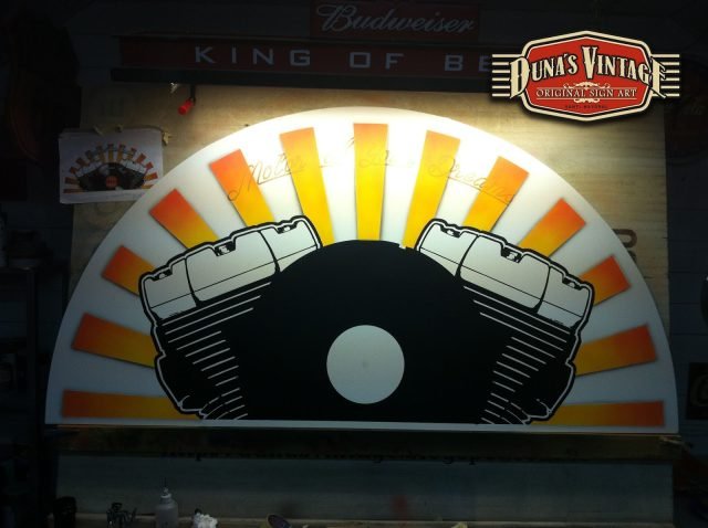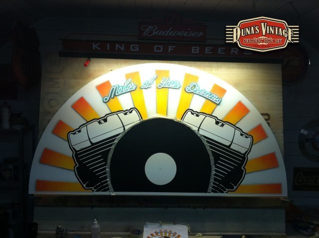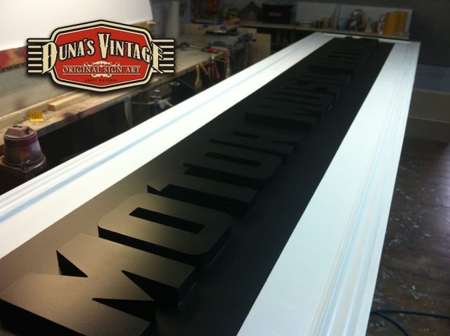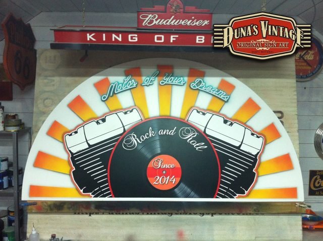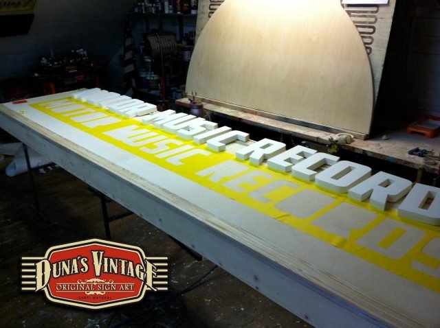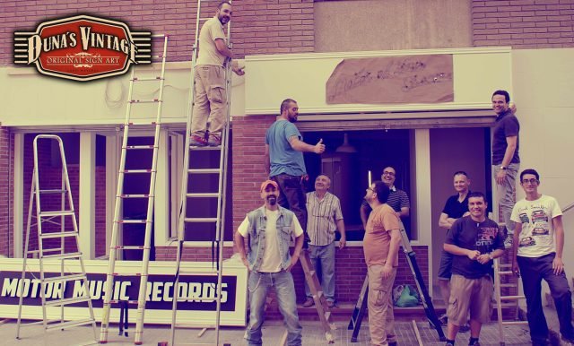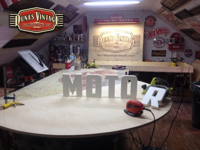 Gran cartel para MOTOR MUSIC RECORDS, este cartel uno de los mas grandes que Duna´s Vintage a pintado de casi 7 metros de largo, a sido un trabajo muy laborioso pero a valido la pena, como se puede apreciar en estas fotos se a trabajado dos cajones de mas de 3 metros cada uno y en la parte principal del cartel con las letras en relieve de 30mm de grueso, en la parte superior una media luna con el logo de la empresa, en la otra parte se han colocado una letras en neon para darle el toque retro que se a querido dar a todo el cartel.