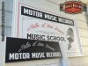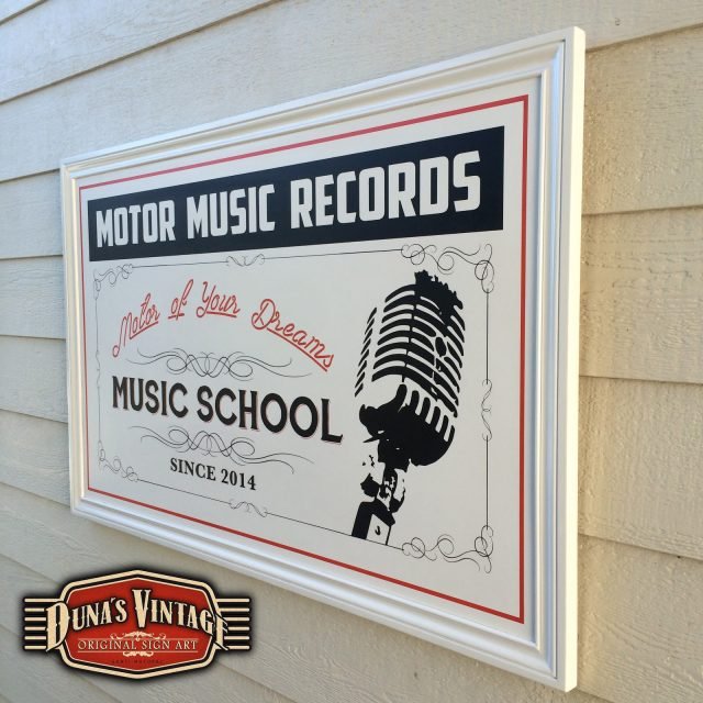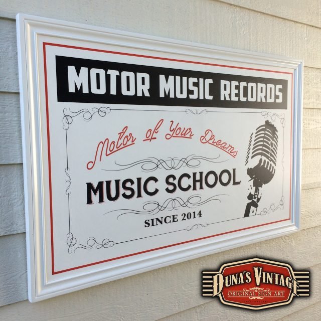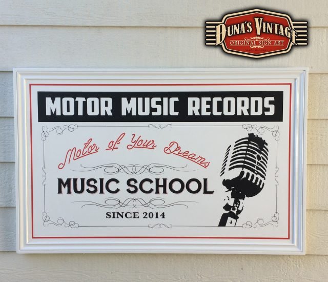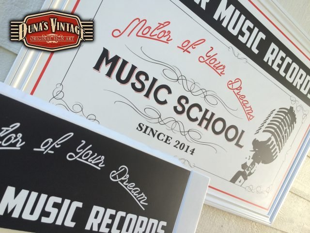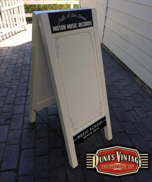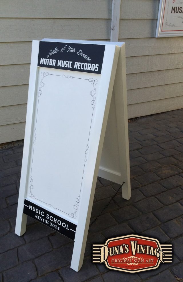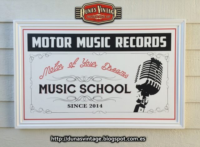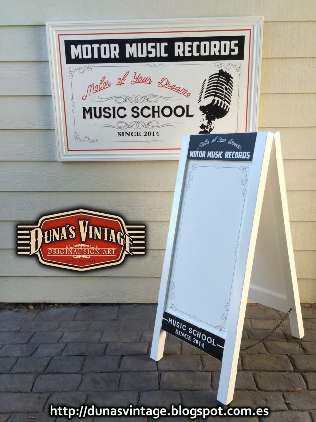 Cartel y pizarra a dos caras para Motor Music Récords, el acabado de estos dos trabajos es en Semi lacado satinado blanco de fondo y luego pintado todo el texto y orlas, el tamaño del cartel es de 1300x800mm y la pizarra de 1200x500mm. Duna´s Vintage