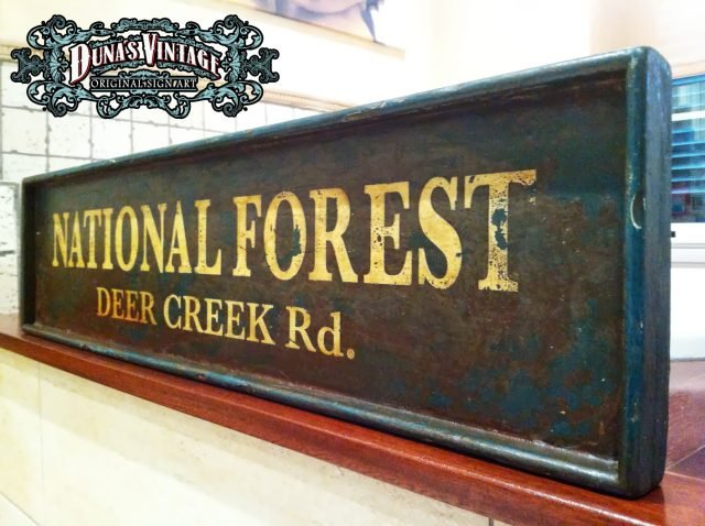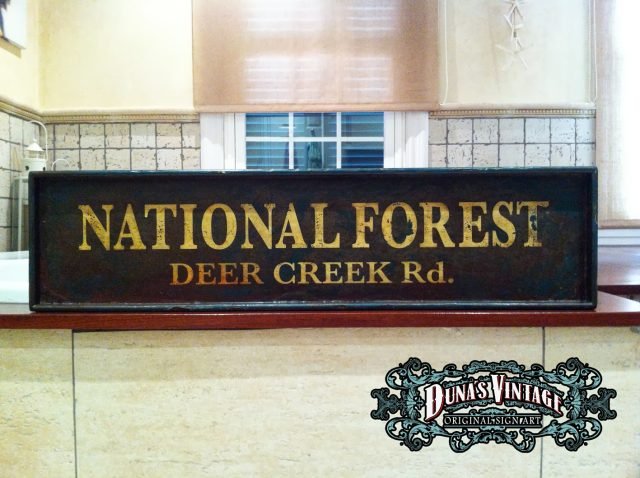 Cartel «NATIONAL FOREST».Tamaño 930x200mm. Este cartel esta tratado con el efecto Retro que Duna´s Vintage emplea en sus carteles pintados a mano. (Hay algunos carteles que se han vendido pero se pueden hacer otros iguales o personalizados con el texto que se quiera). Duna´s Vintage.