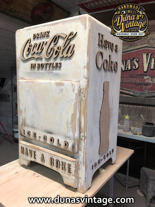 Nevera de madera de los años 30 restaurada y convertida en una nevera de Coca-Cola con letras en relieve en las fotos podréis ver el proceso de transformación.