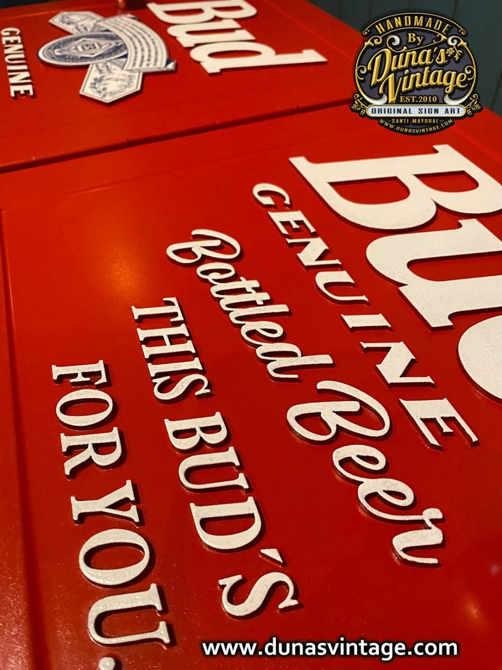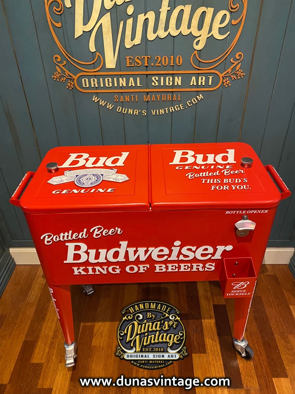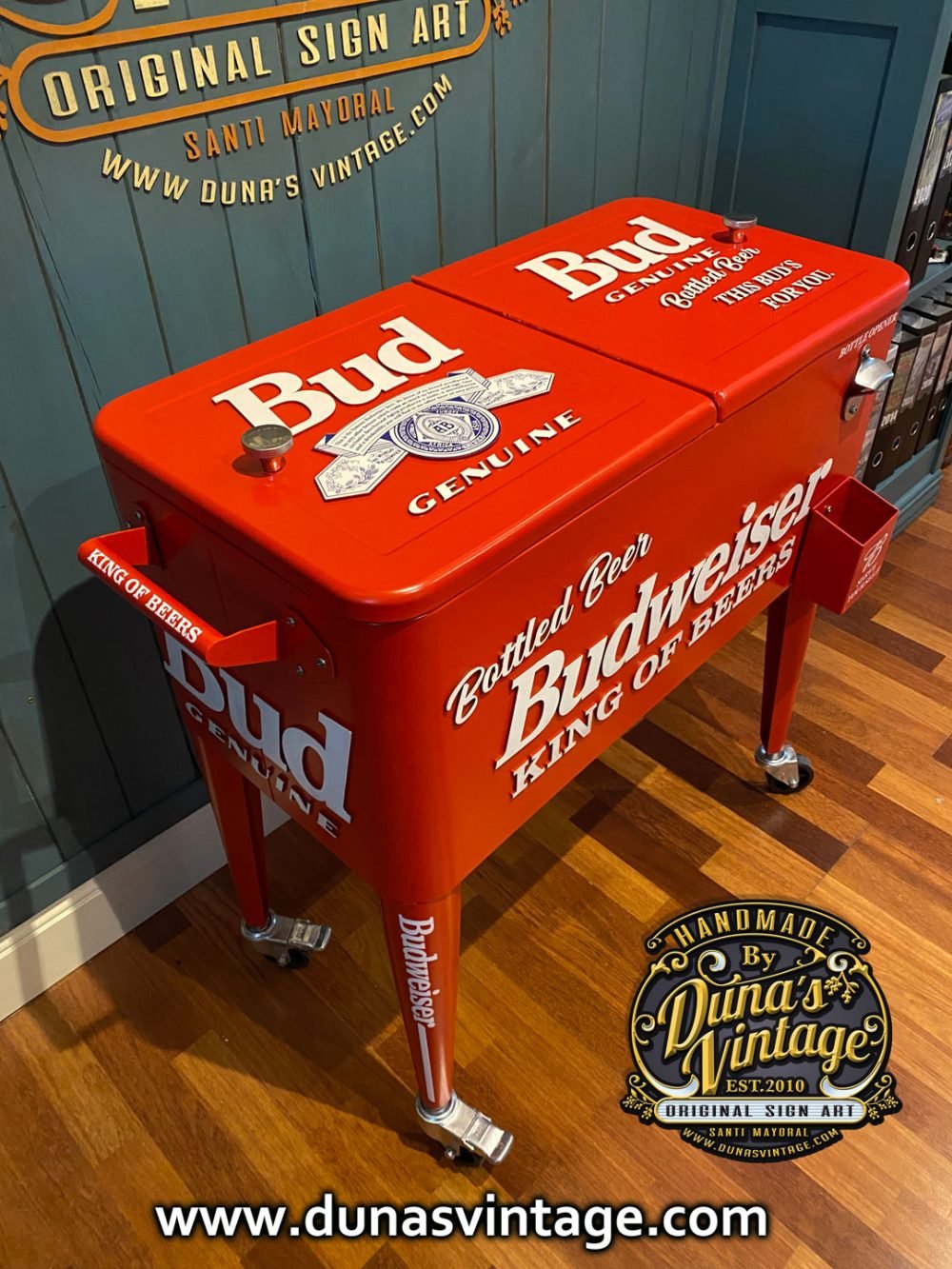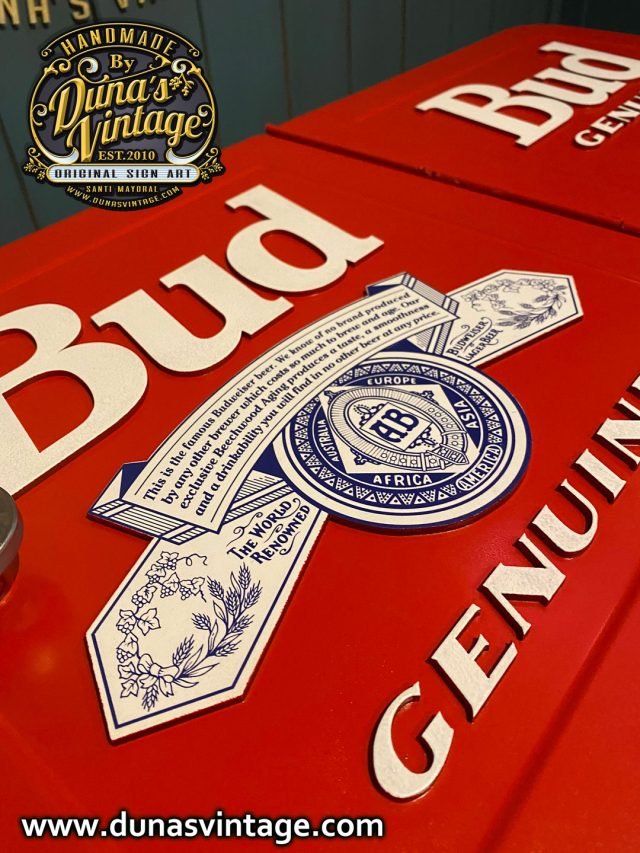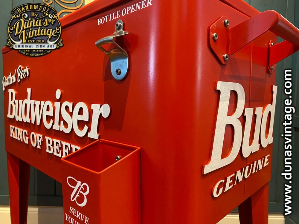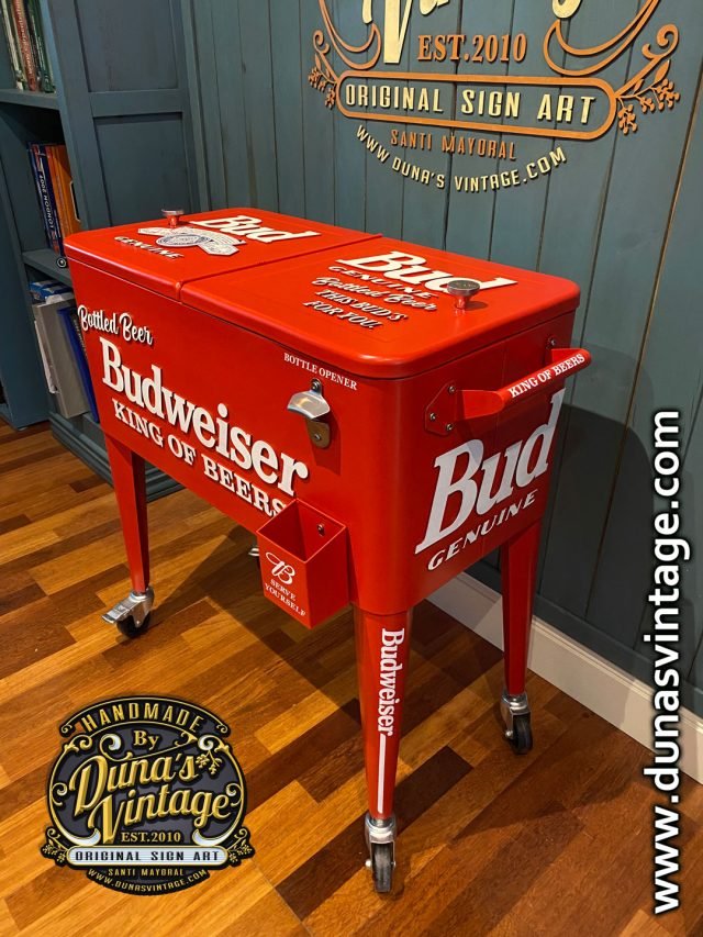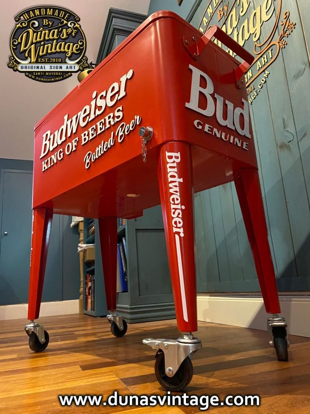 Hola os presento un nuevo producto de Duna´s Vintage, aquí tenéis una nevera nueva para estrenar pero personalizada esta vez de Budweiser, se puede personalizar de la marca que se quiera, como podéis apreciar en las fotos no le falta detalle, con letras en relieve de 4mm. Ya podéis tener vuestra nevera para fiestas y barbacoas al mas estilo U.S.A. el tamaño es de 85cm de alto x 78cm de largo y 39cm de ancho.