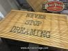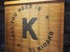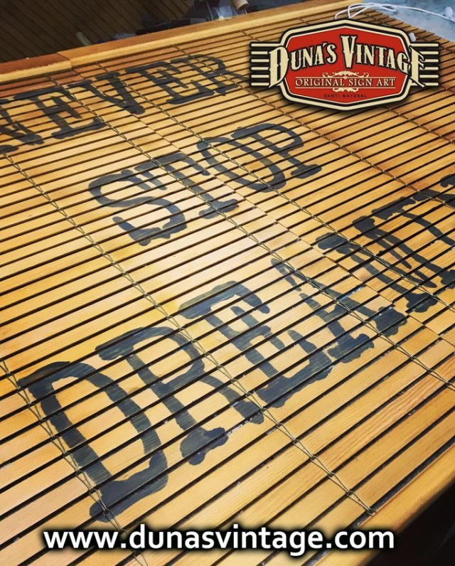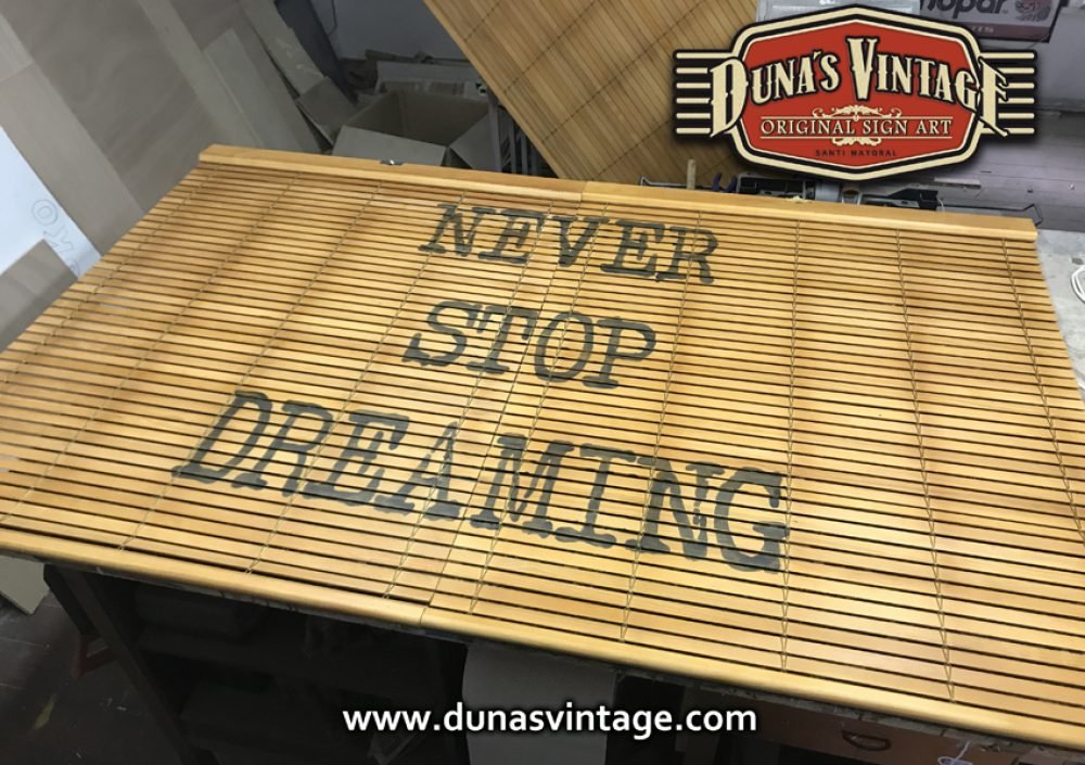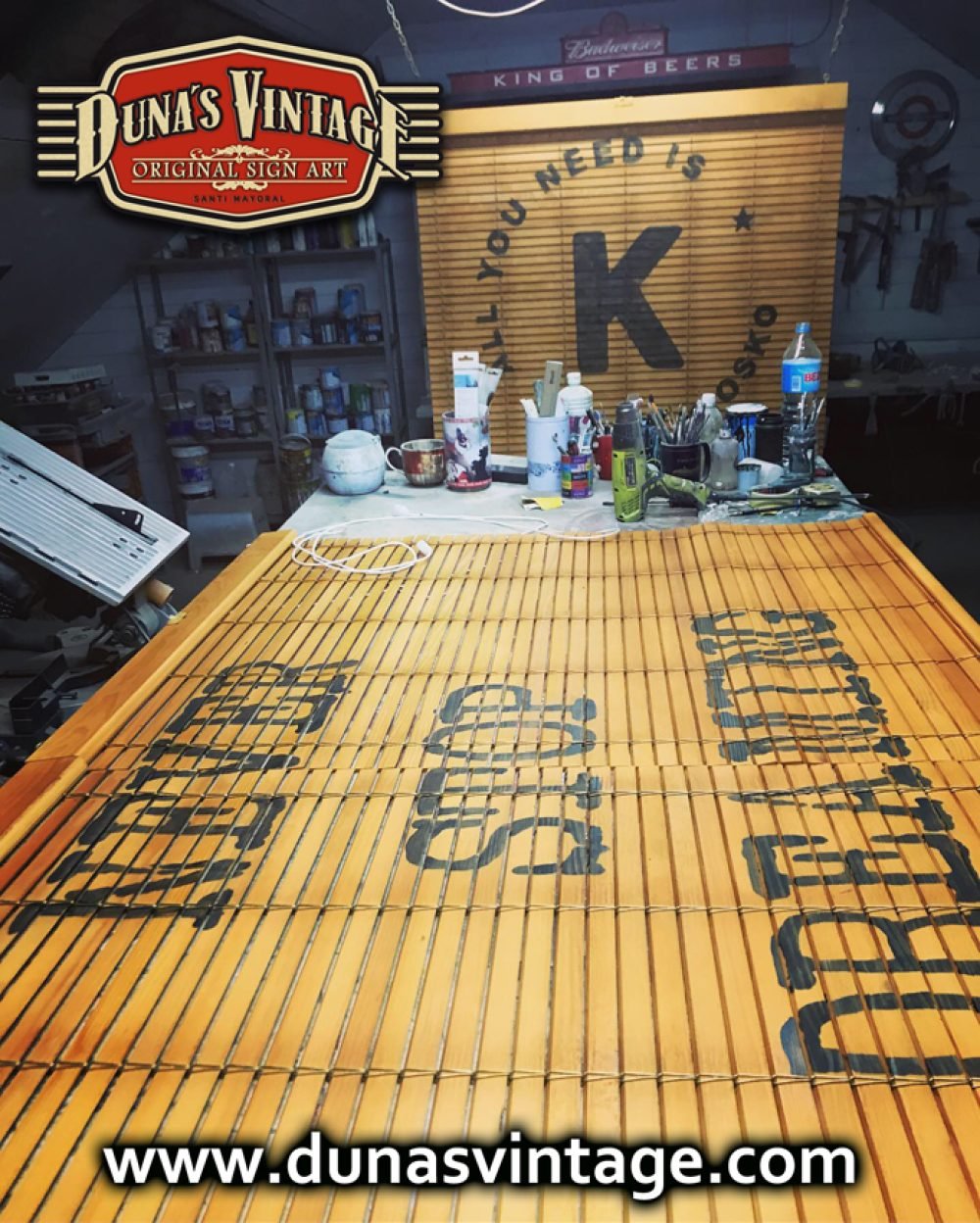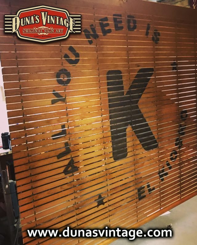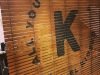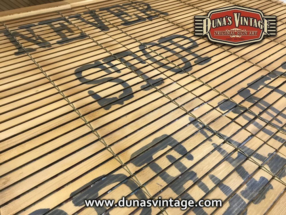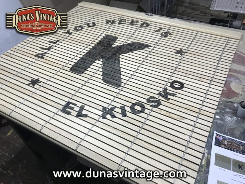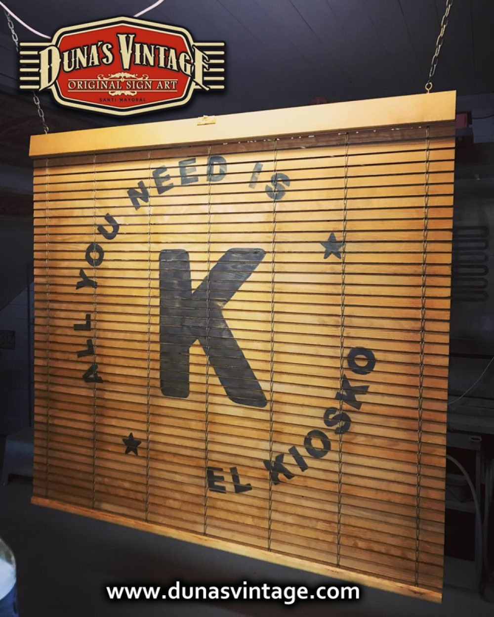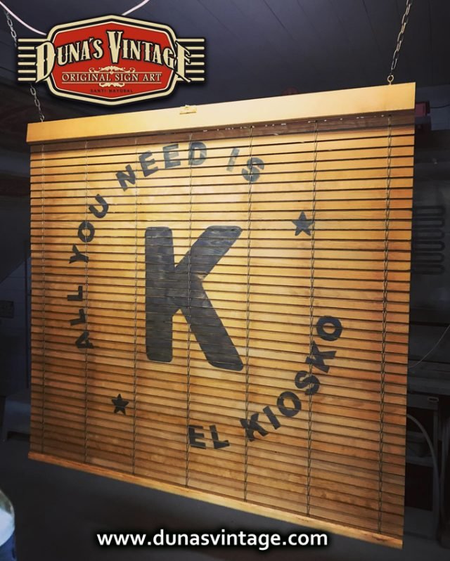 Persianas Alicantinas EL KIOSKO Chamartín, tamaño 1300x1500mm pintadas a dos caras con el logo del kiosko y efecto envejecido.