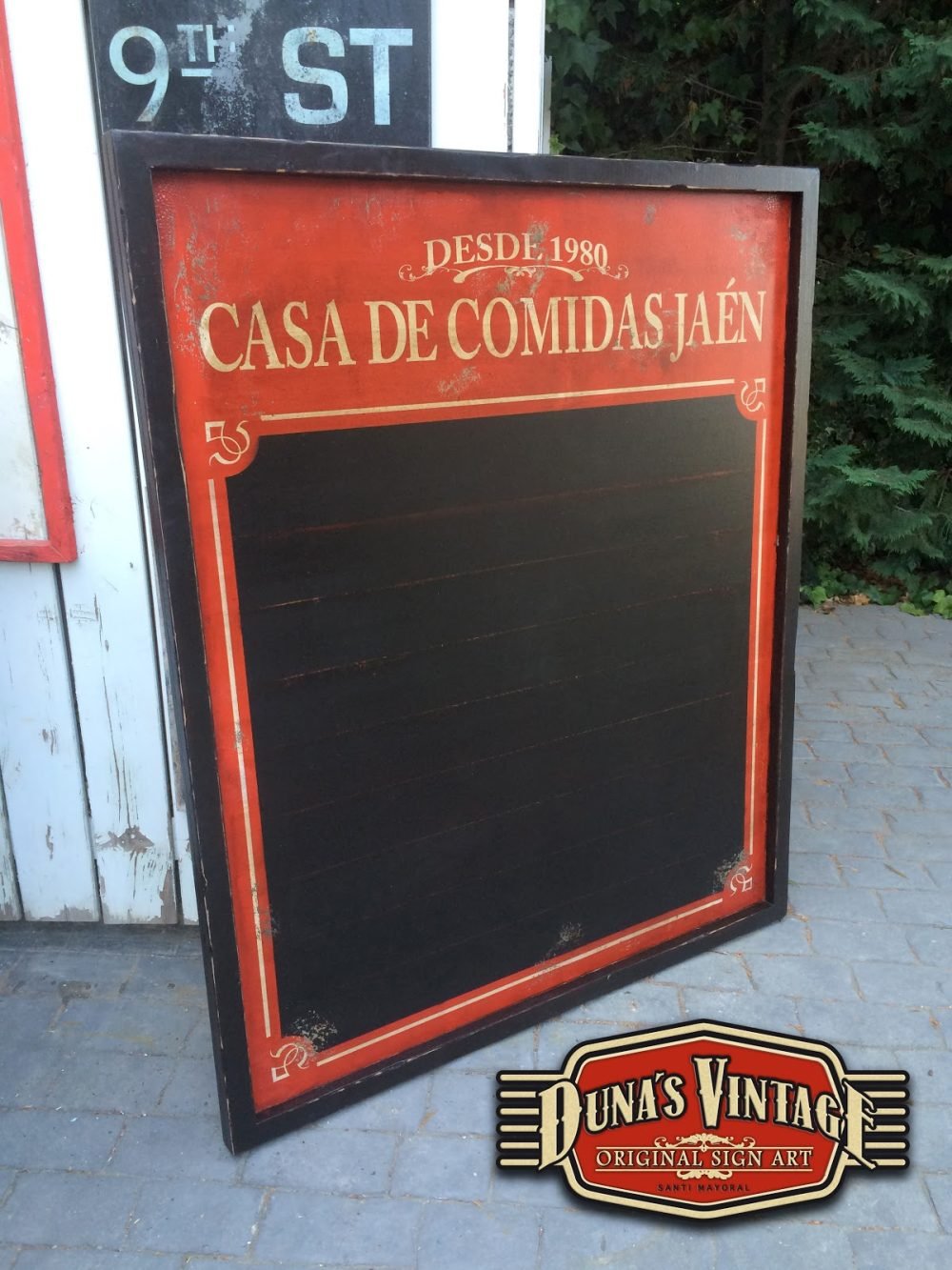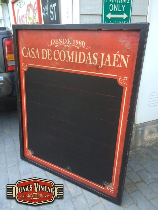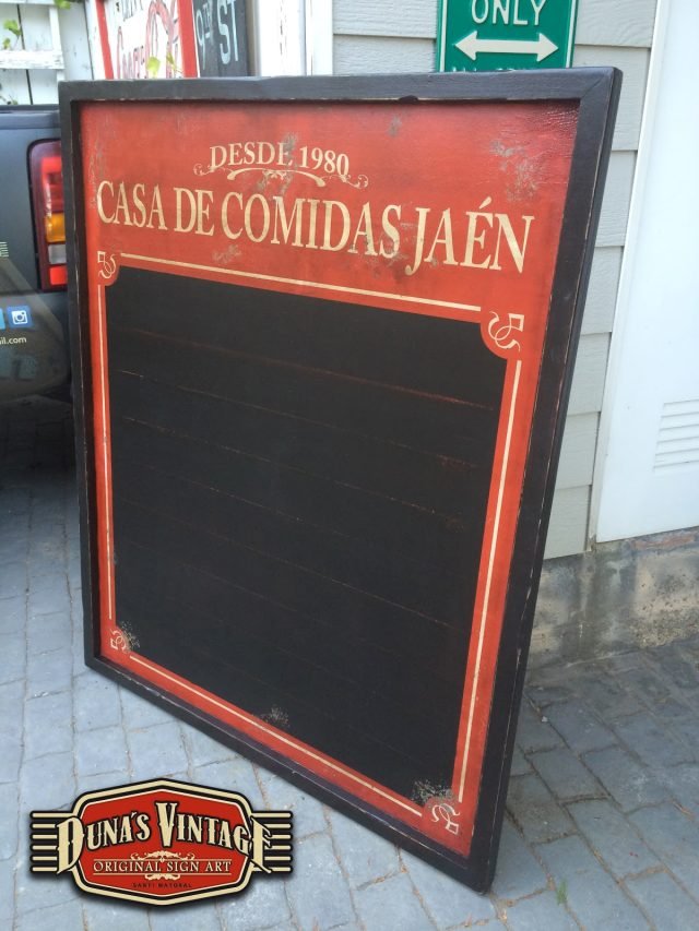 Pizarra de madera para el restaurante Casa de Comidas Jaén (Alicante), el tamaño de la pizarra es de 1500x1250mm trabajado con las técnicas que Duna´s Vintage emplea en sus trabajos.