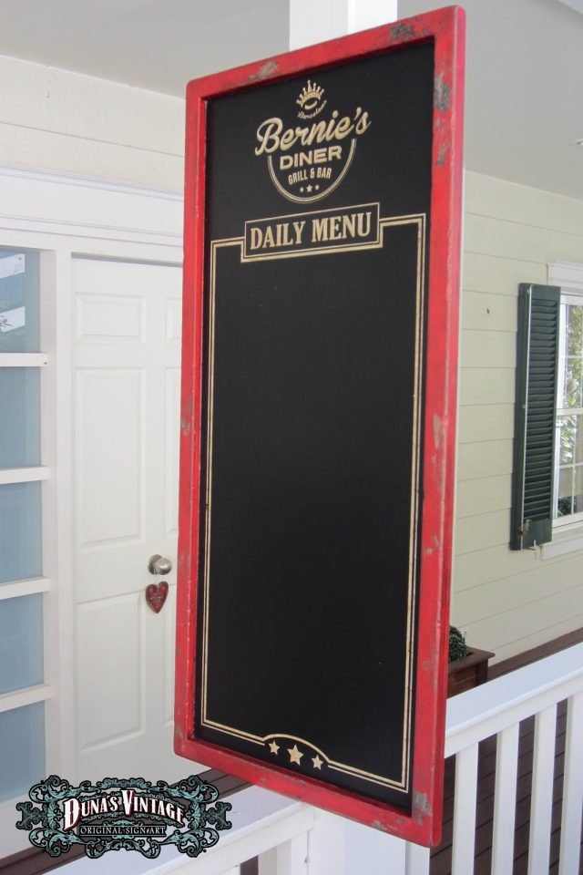 Pizarra menu «BERNIE´S.» tamaño 1300x600mm. Esta pizarra esta tratado con el efecto Retro que Duna´s Vintage emplea en sus carteles.