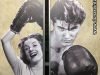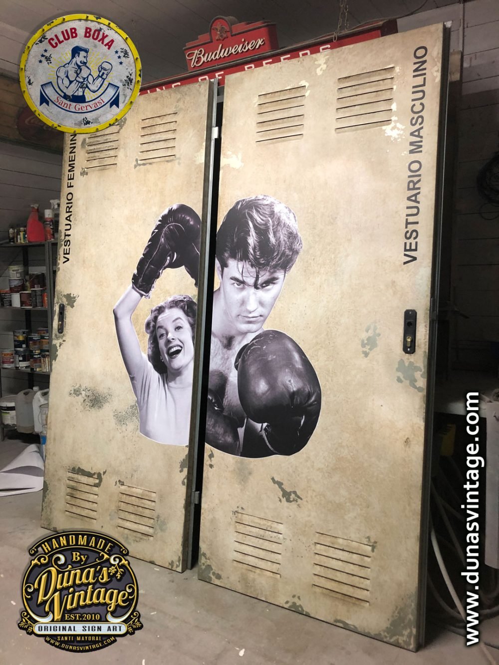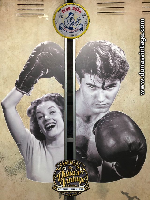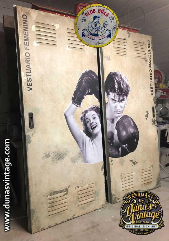 Puertas metálicas para vestuario del nuevo CLUB BOXA de Sant Gervasi de Barcelona, las puertas se han trabajado para darle un aire industrial como el cartel y vinilida con imagen vintage de la época.
