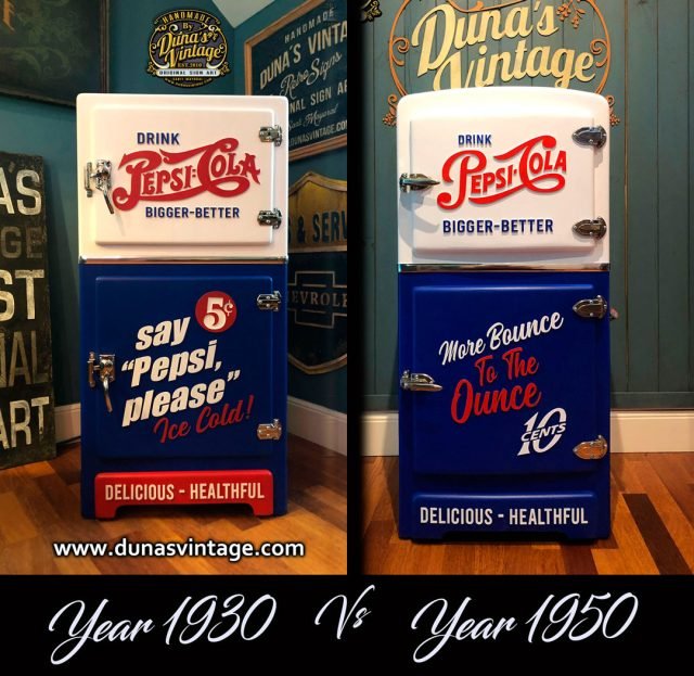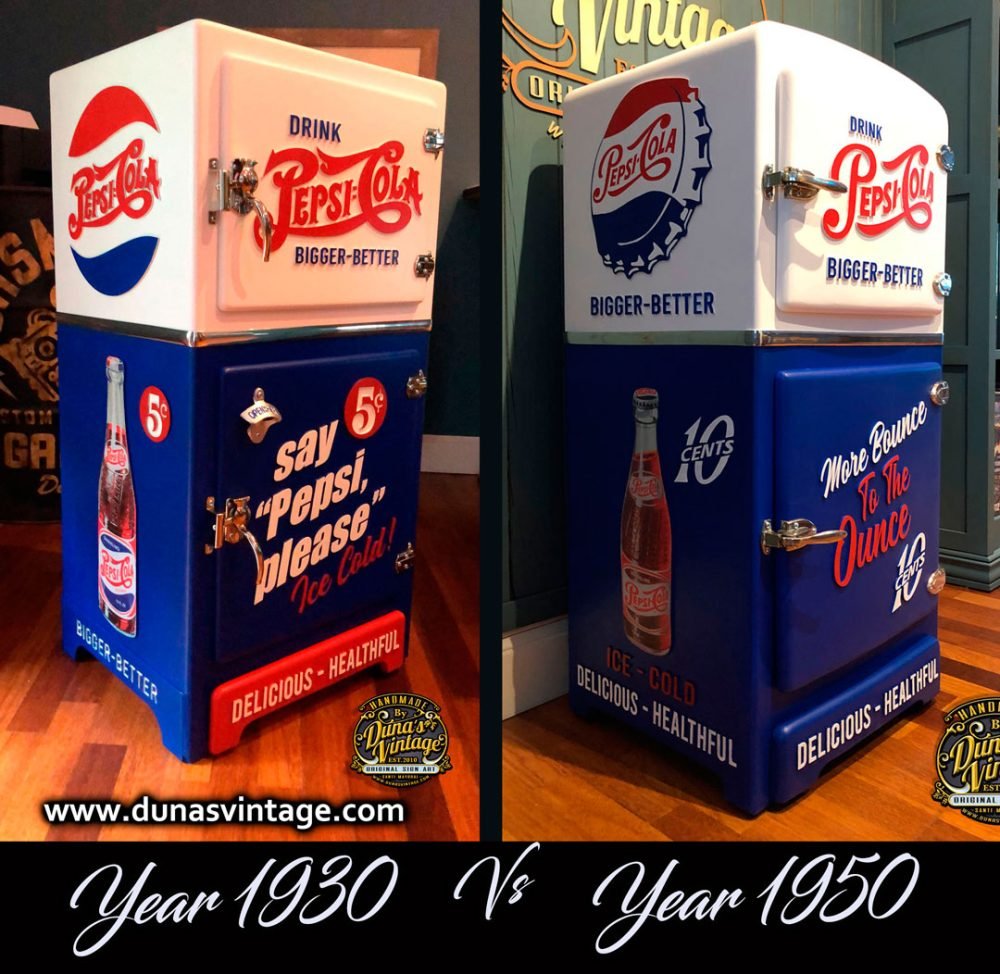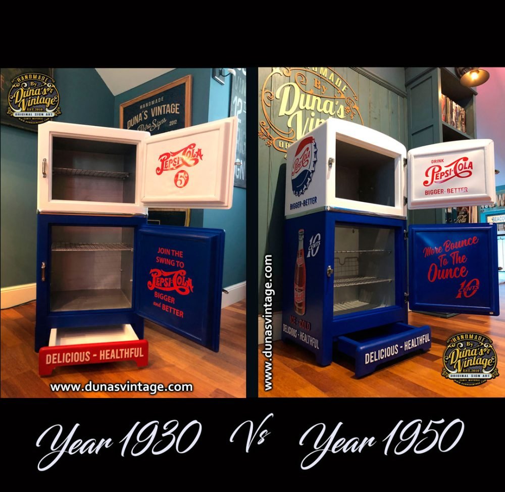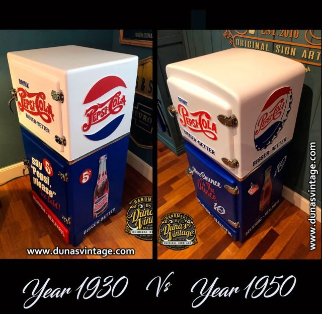 Aquí os dejo dos heladeras personalizadas de Pepsi-Cola, como podéis apreciar en los dos modelos lo que cambia es el logotipo y la botella que en los años 30 usaban este logotipo y la botella y en la versión de los 50 retocaron el logotipo algo mas modernizado y la botella también cambiaron. Se mantuvo el color blanco y azul muy típico de Pepsi-Cola que a día de hoy siguen trabajando. El tema es que modelo os gusta mas de los 30 o los 50. Muchas gracias.