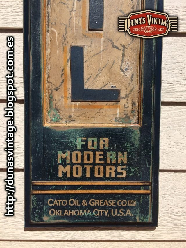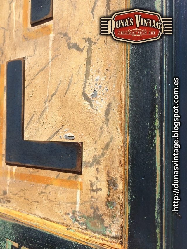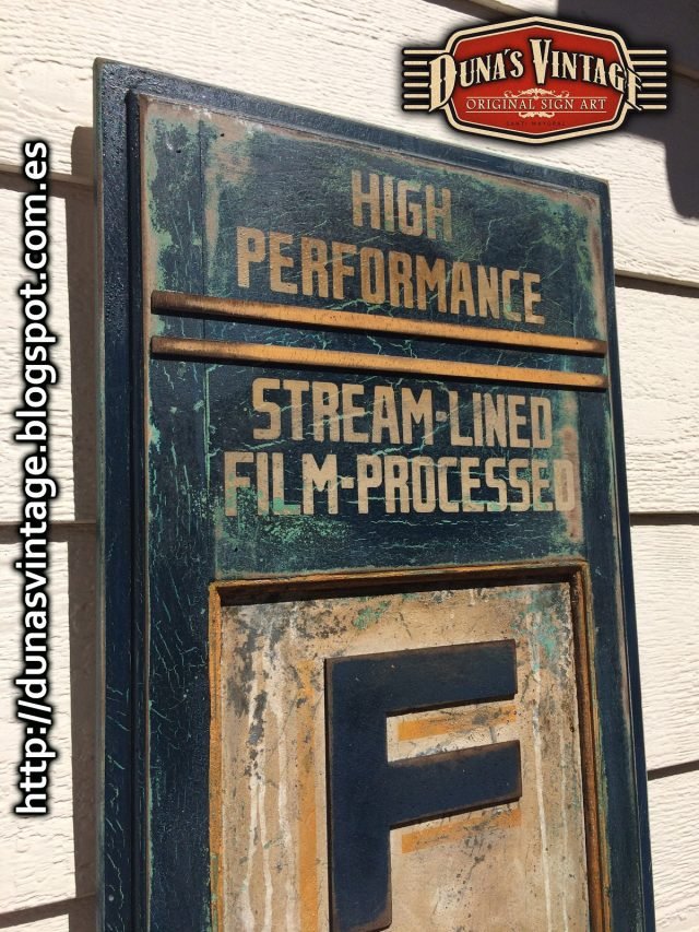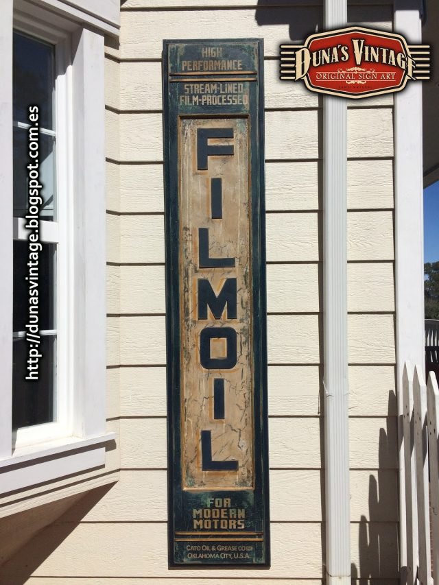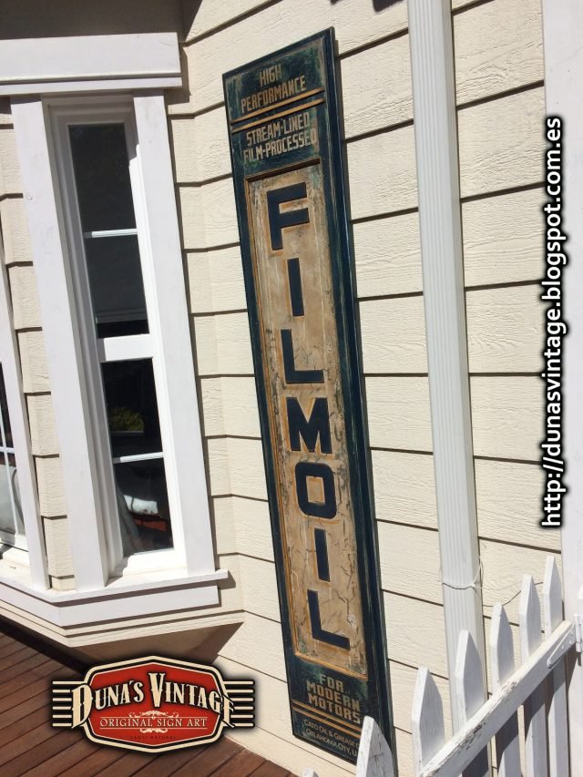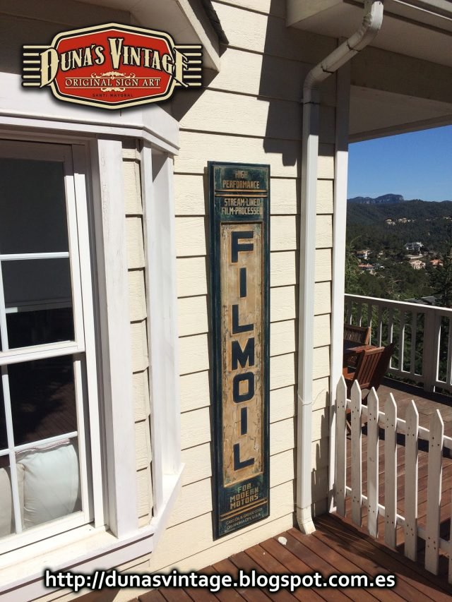 Réplica cartel FILMOIL fabricado en madera y pintado a mano, tamaño 2000x380mm, este cartel se a trabajado con diferentes capas de pinturas para conseguir diferentes tonos de color en el envejecimiento del cartel.
