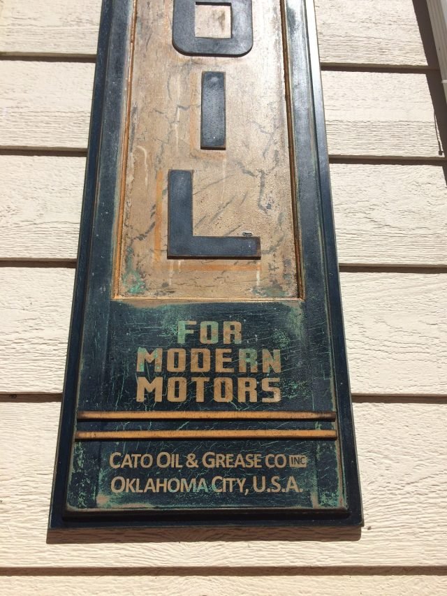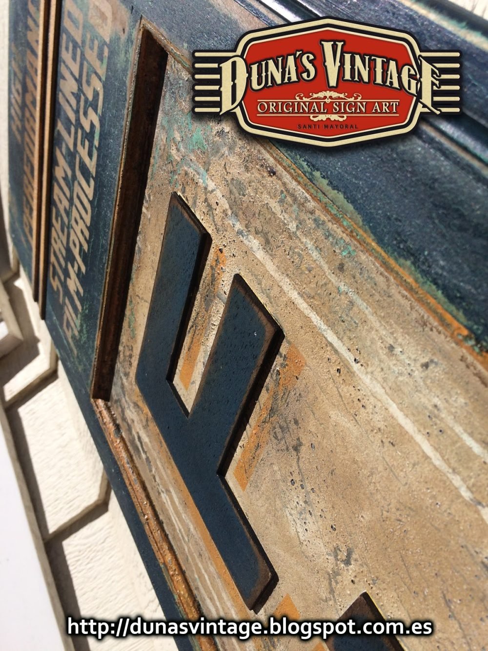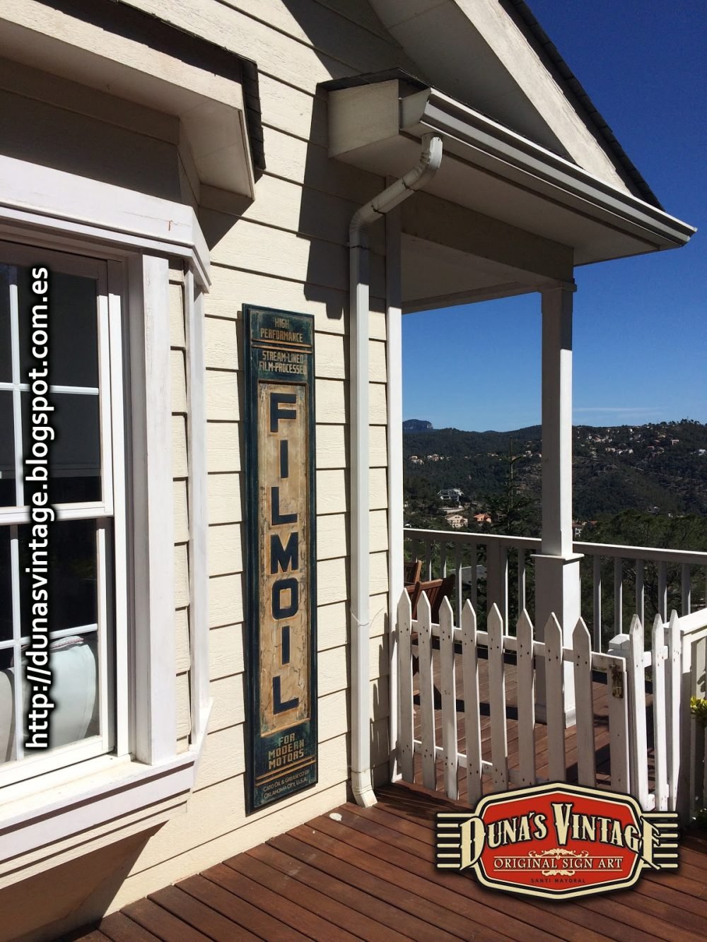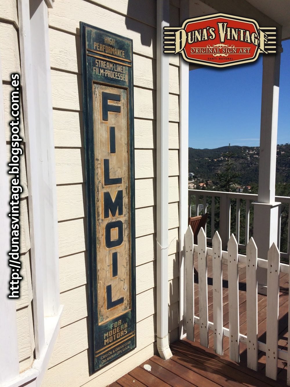 Réplica cartel FILMOIL fabricado en madera y pintado a mano, tamaño 2000x380mm, este cartel se a trabajado con diferentes capas de pinturas para conseguir diferentes tonos de color en el envejecimiento del cartel.