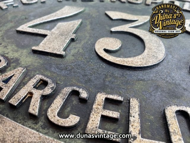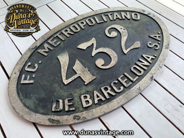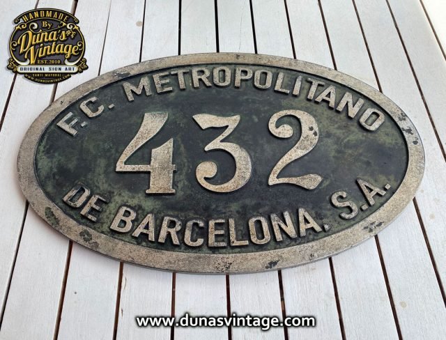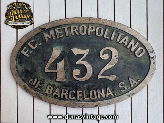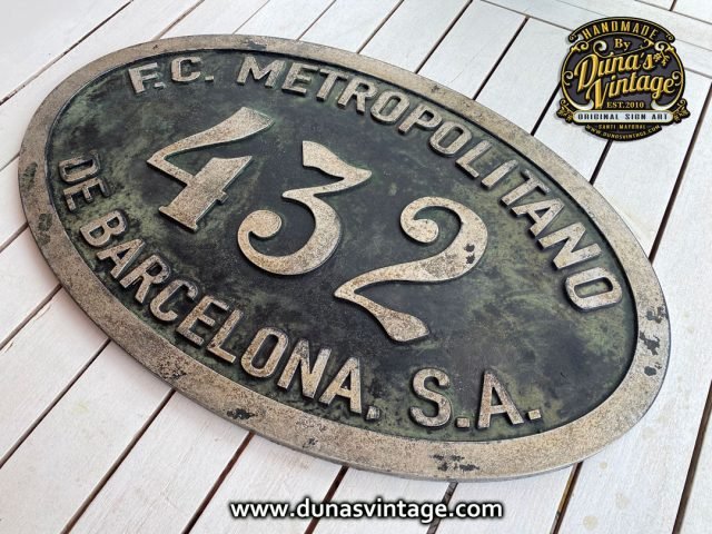 Aquí os dejo una réplica de una placa antigua del F.C. 432 Metropolitano de Barcelona tamaño 540x340mm, fabricada en madera DM cortada a láser y trabajada para darle el aspecto de metal, zinc envejecido por el paso de los años.