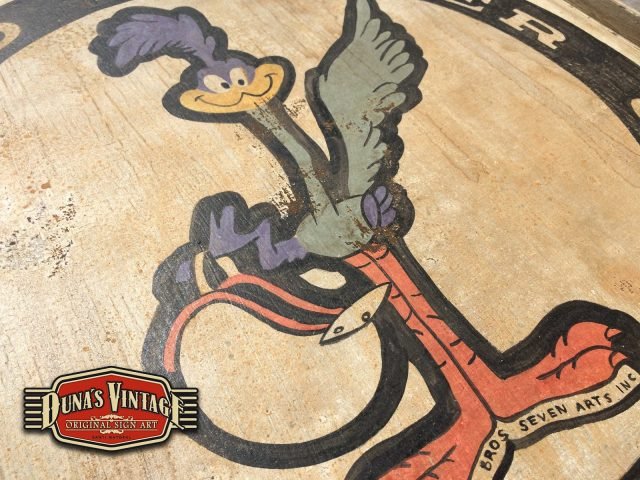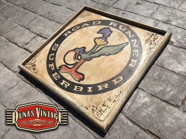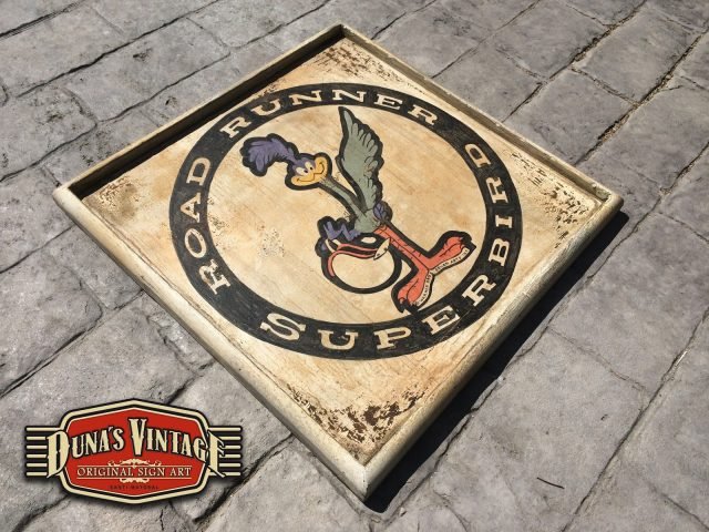 Cartel con el logotipo que Chrysler utilizo a finales de los 60 con un modelo del coche llamado Plymouth Road Runner, el tamaño del cartel es de 540x540mm y trabajado con las técnicas que Duna´s Vintage emplea en sus carteles.