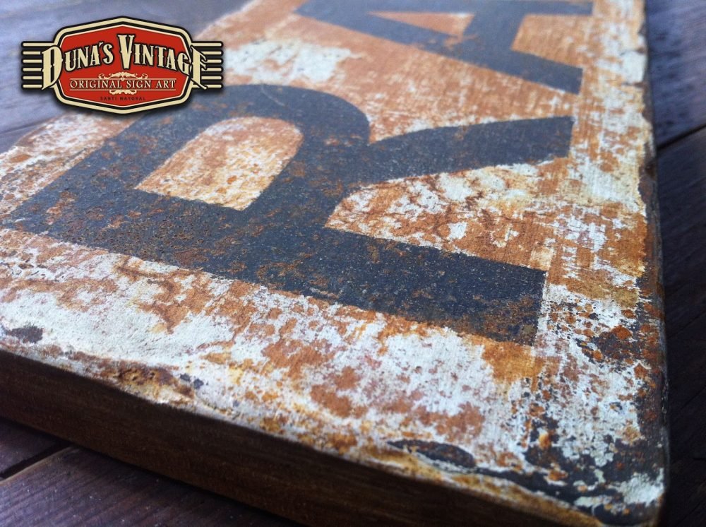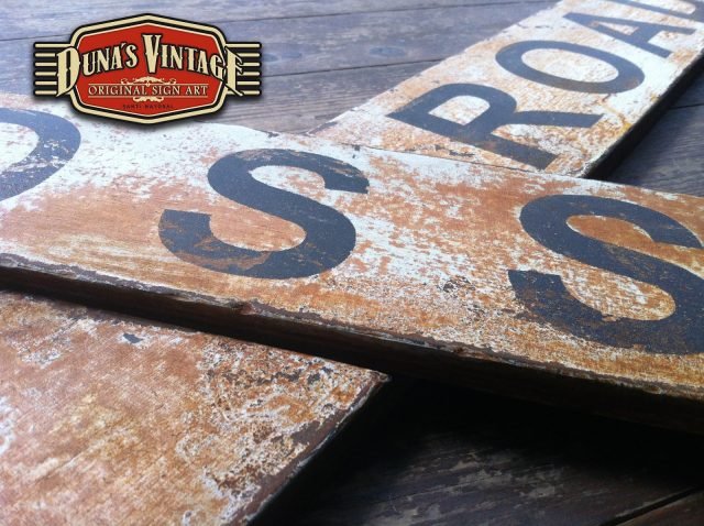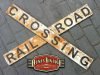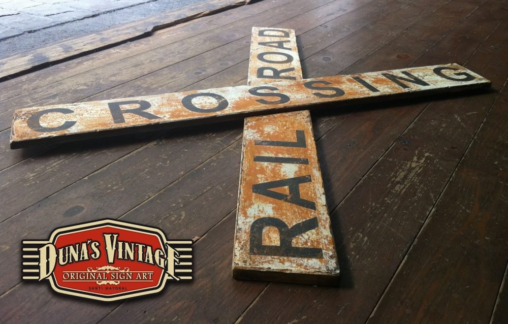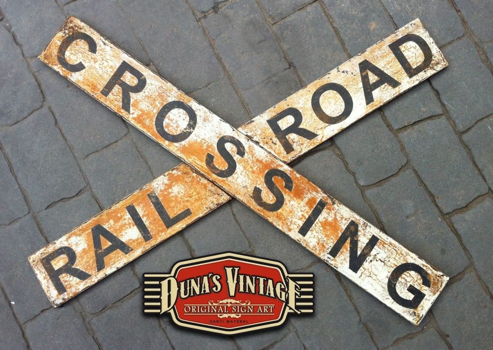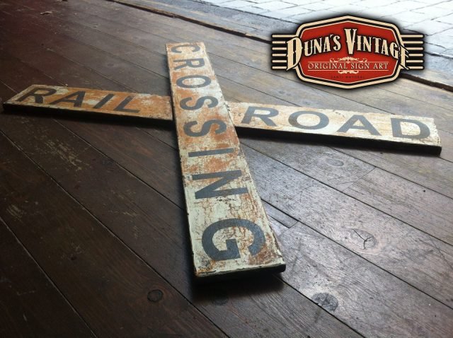Señal de cruce RAIL ROAD CROSSING tamaño 1000x120mm esta replica de señal ferroviaria esta trabajado con las técnicas que Duna´s Vintage emplea en sus carteles.