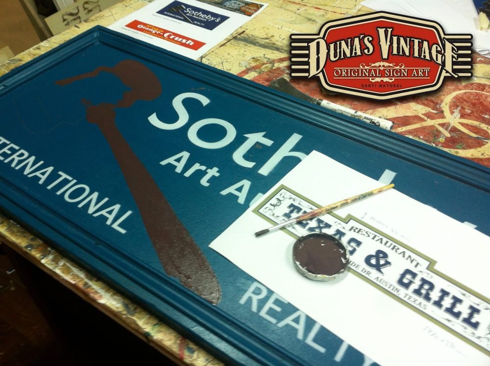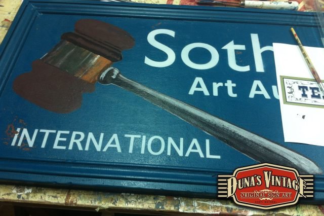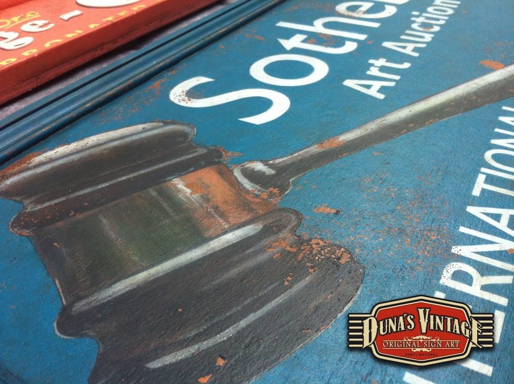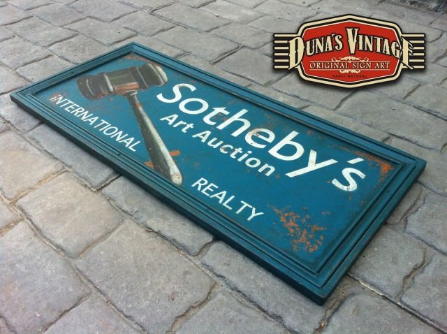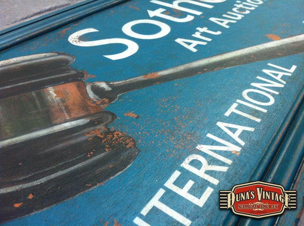 Encargo para Cantabria cartel «Sotheby´s´».Tamaño 850x400mm. Este cartel es de una casa de subastas muy importante a nivel internacional. Este cartel esta tratado con el efecto Retro que Duna´s Vintage emplea en sus carteles pintados a mano.