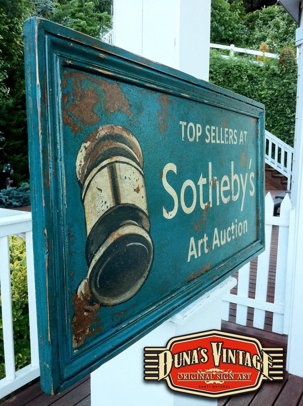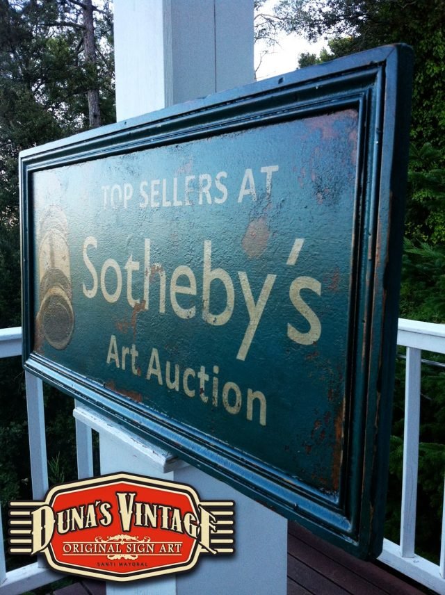 Cartel «Sotheby´s´».Tamaño 800x400mm. Este cartel es de una casa de subastas muy importante a nivel internacional. Este cartel esta tratado con el efecto Retro que Duna´s Vintage emplea en sus carteles pintados a mano. (Hay algunos carteles que se han vendido pero se pueden hacer otros iguales o personalizados con el texto que se quiera). Duna´s Vintage.