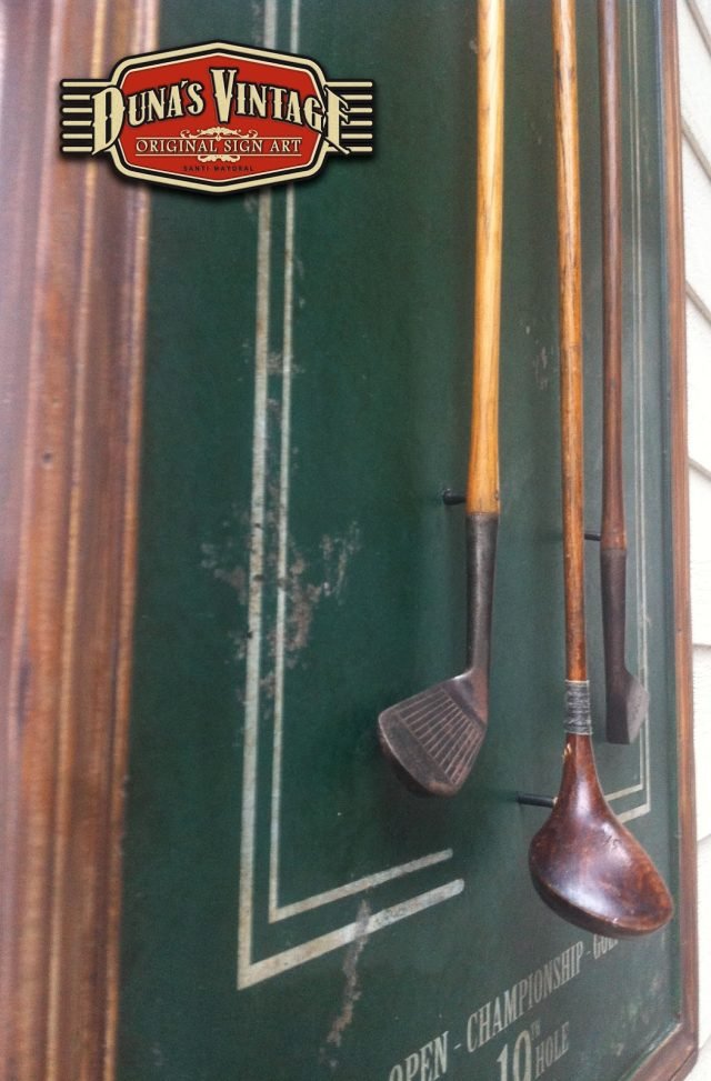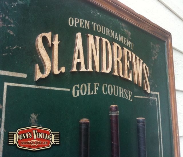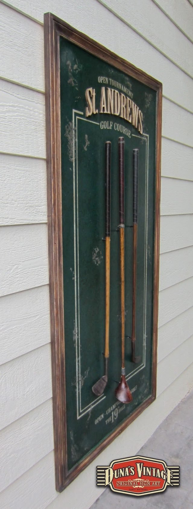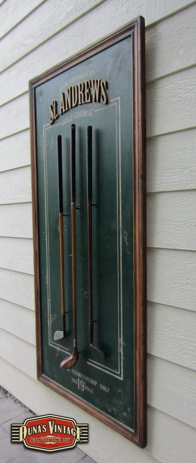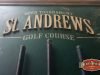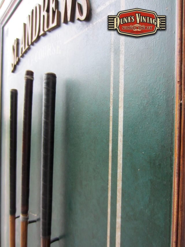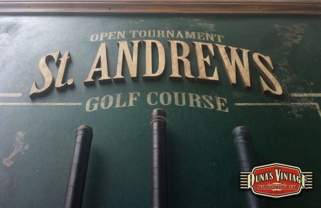 Cartel St. Andrews Golf tamaño 1600x757mm, en este cartel el cliente me proporciono los 3 palos de golf para integrarlos en el cartel, las molduras se han trabajado con tinte a la cera para darle el tono parecido a los palos, las letras de St. Andrews están fabricadas en relieve, el resultado final a sido un cartel muy autentico y original.
