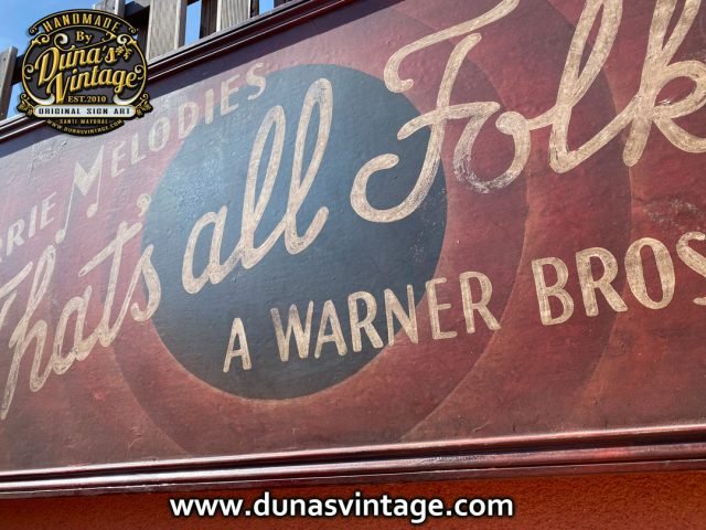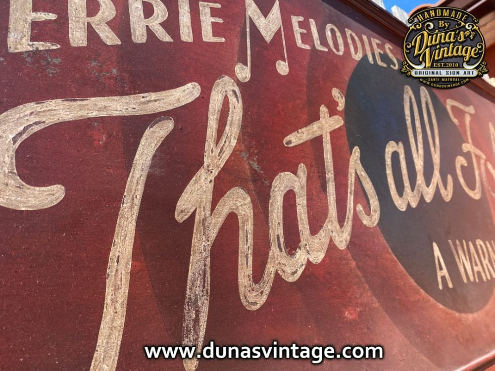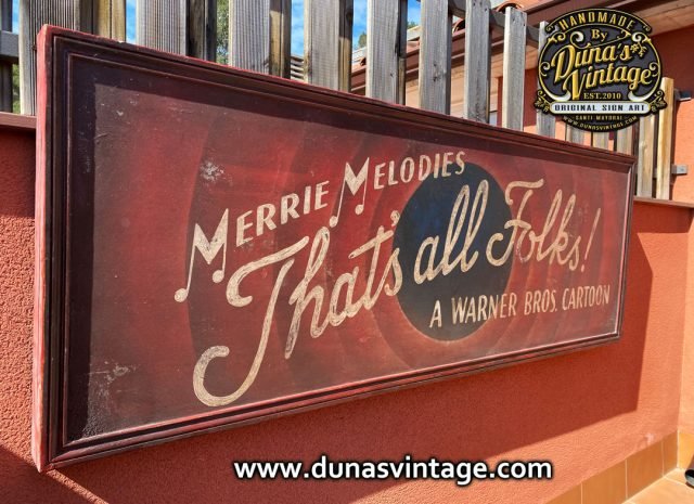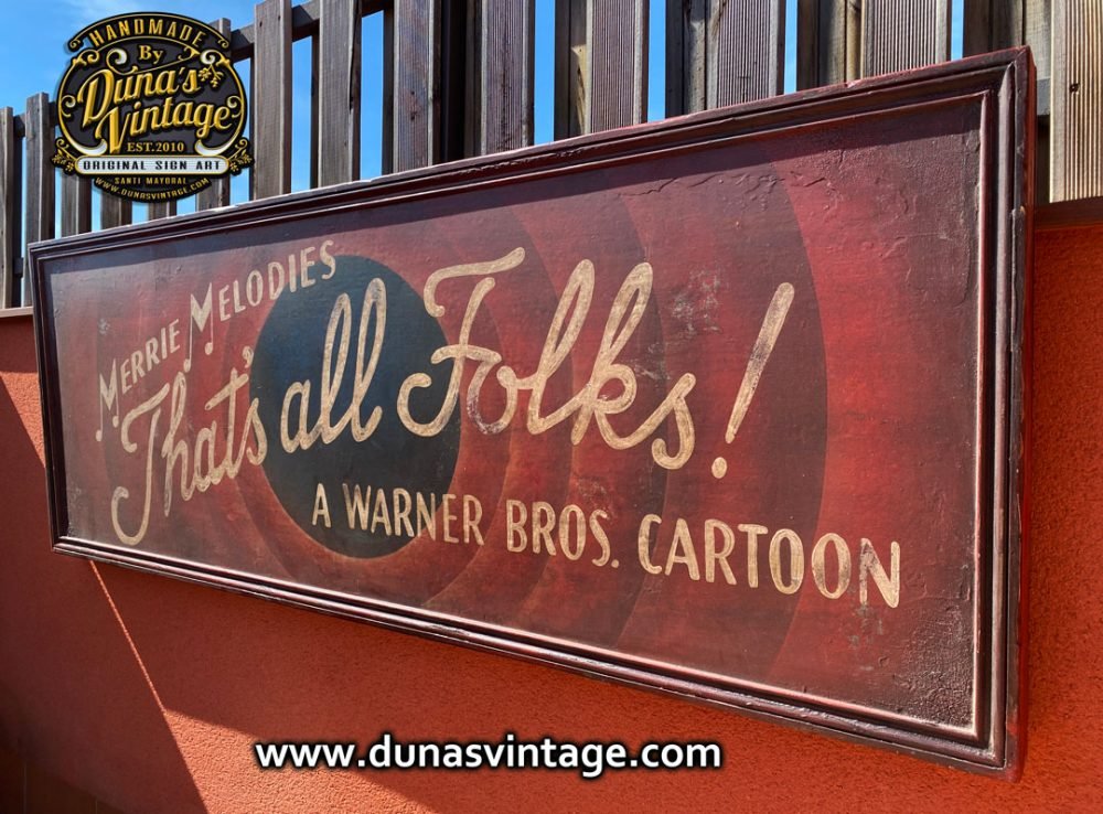 Quien no se acuerda de ¡Eso es todo amigos! ahora podrás tener el mítico cartel para decorar tu comedor, estancia etc.. con la imagen de nuestra infancia That´s all Folks! a Warner Bros. Cartoon. Cartel pintado a mano en gran formato 180x65cm.