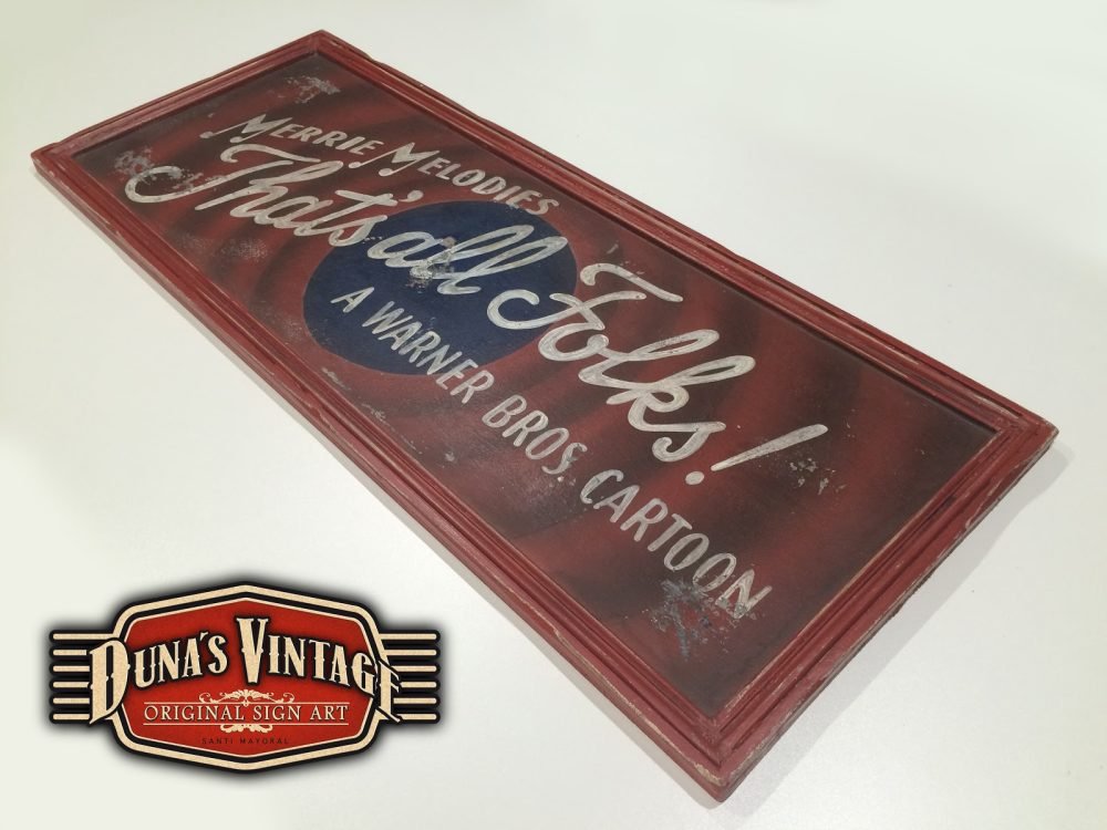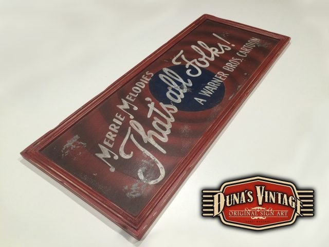 Cartel «That´s all Folks! Duna´s Vintage».Tamaño 850x350mm. Este cartel esta tratado con el efecto Retro que Duna´s Vintage emplea en sus carteles pintados a mano. (Hay algunos carteles que se han vendido pero se pueden hacer otros iguales o personalizados con el texto que se quiera). Lo puedes encontrar en Vintage 50.