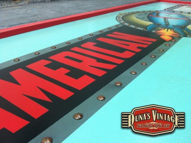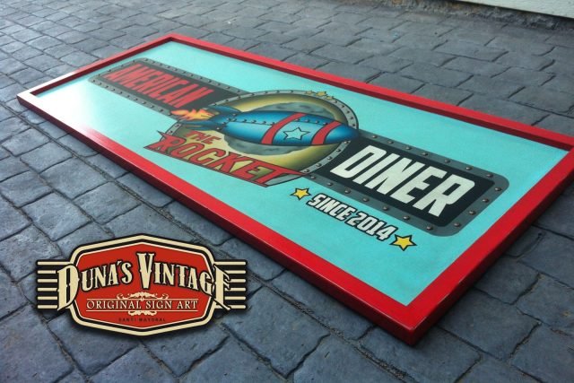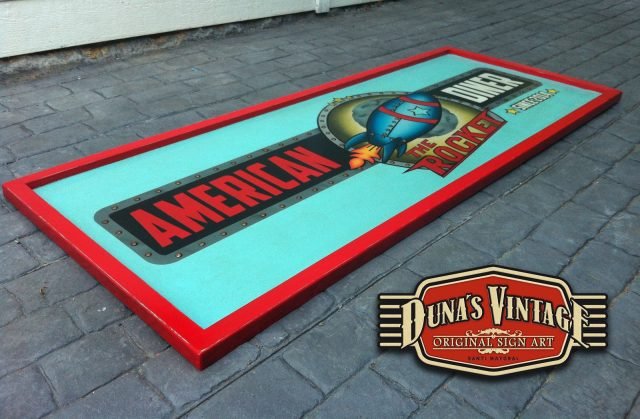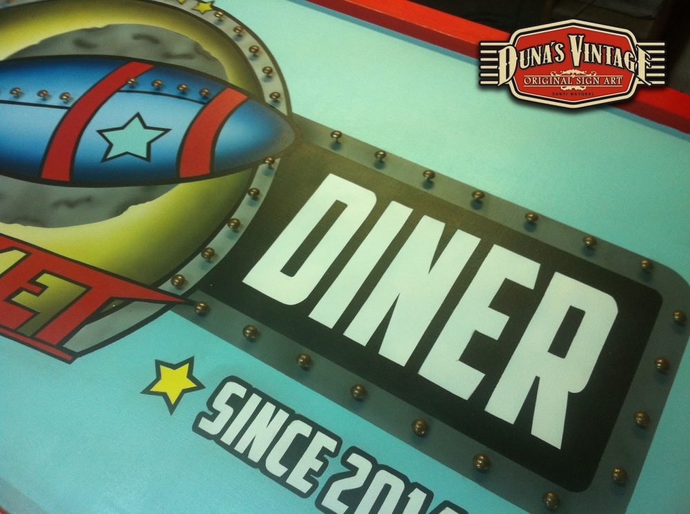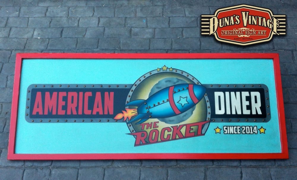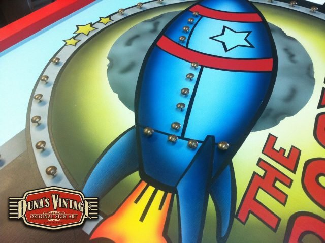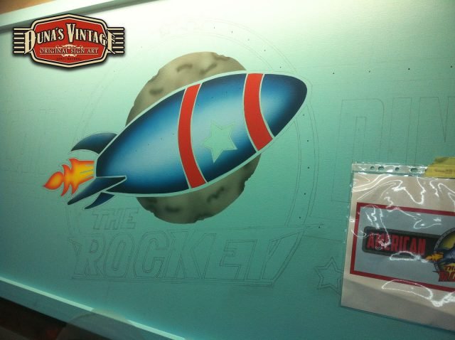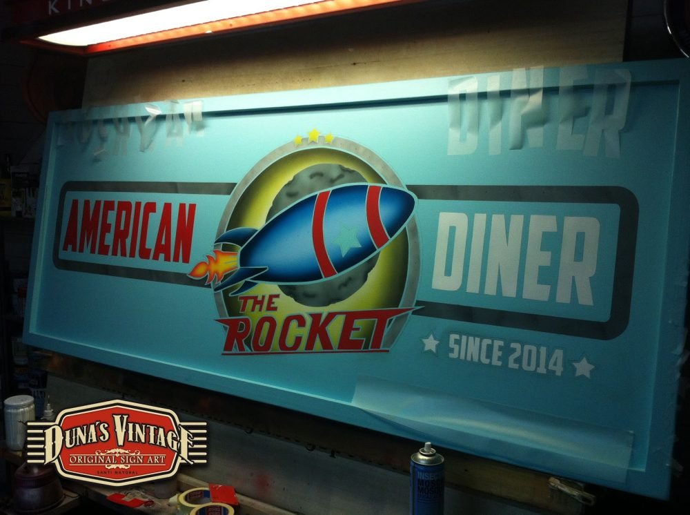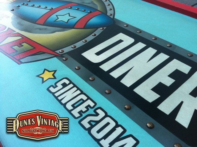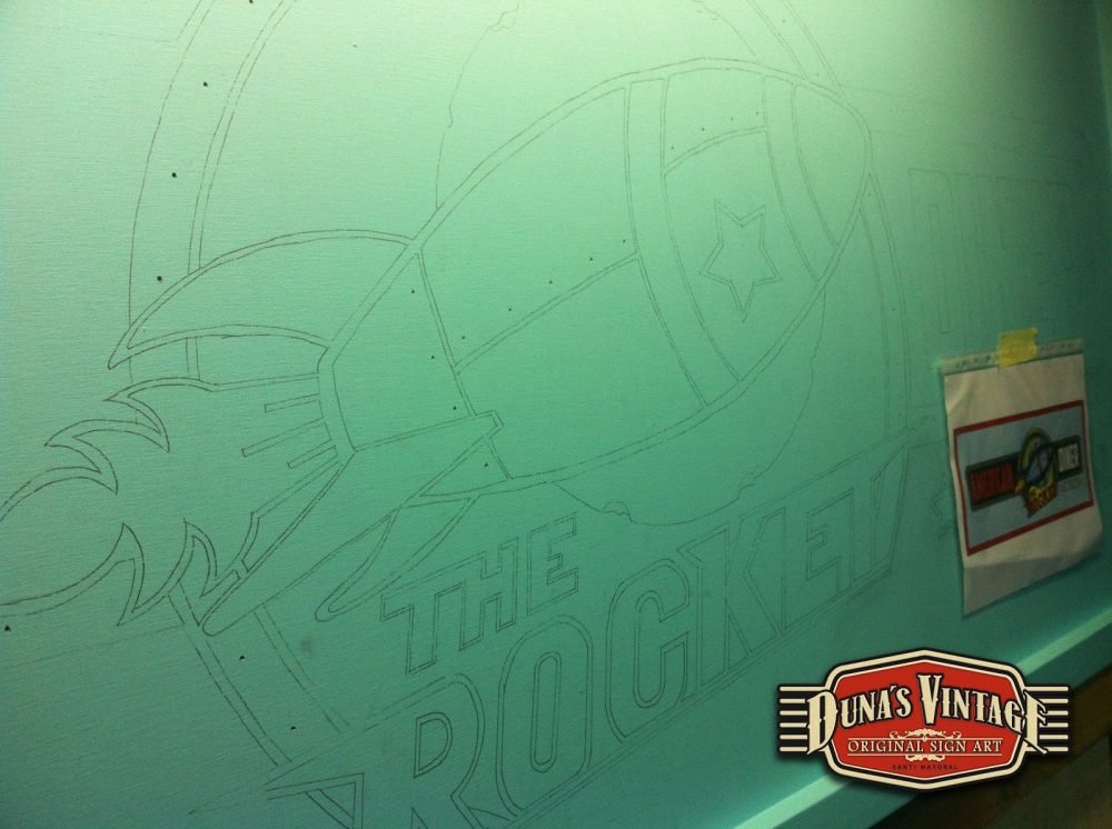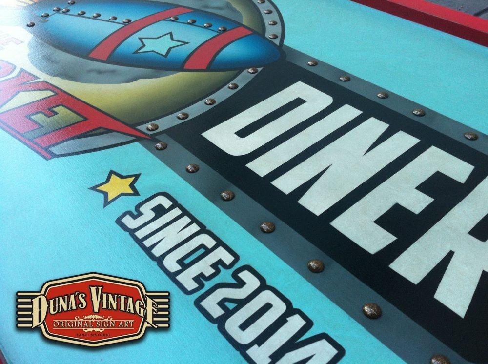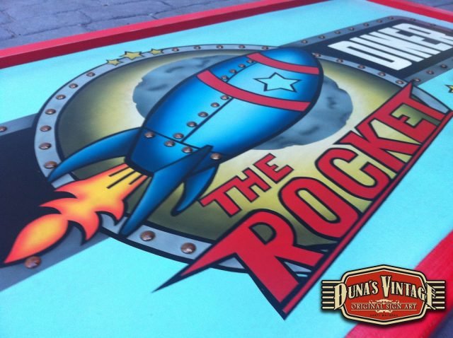 Este cartel es para The Rocket , Las Rozas (Madrid) tamaño 2000x800mm como se puede apreciar en el proceso de este cartel se a trabajado todo con mascaras cortadas a mano y sin darle el desgastado que Duna´s Vintage emplea en sus carteles.