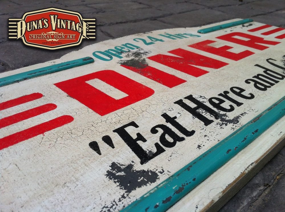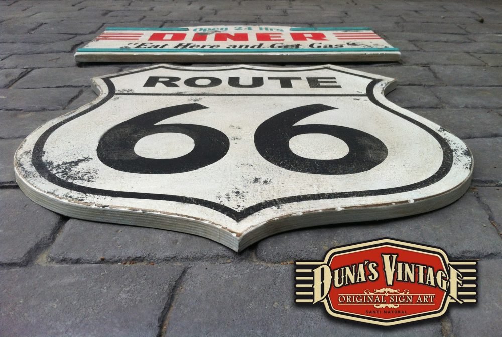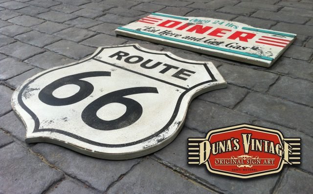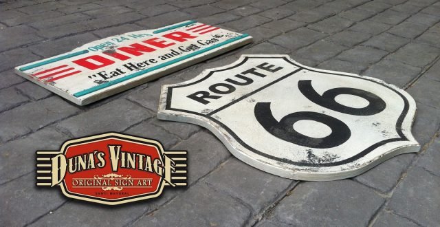 Estos dos carteles són para The Rocket en las Rozas Madrid, el cartel de ROUTE 66 es del tamaño 600x600mm y el de Diner 24Hrs de 700x360mm los dos con el acabado que Duna´s Vintage emplea en sus carteles, este tipo de carteles quedan muy bien para decorar Bares y Restaurantes temáticos Americanos o en el garaje de casa o como algunos clientes que lo tienen en el comedor de sus casas, quedan muy auténticos.