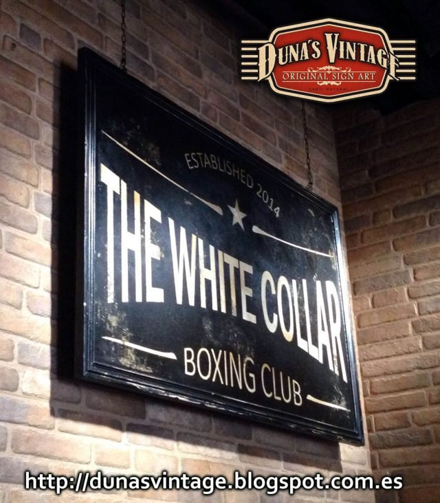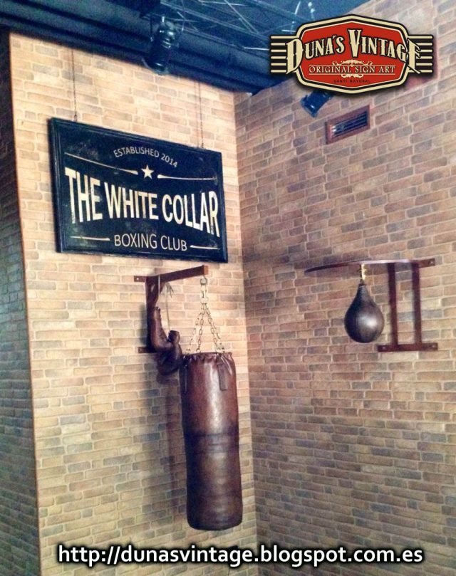 El cliente del gimnasio The White Collar de Madrid me envía unas fotos del cartel ya colgado en una zona muy autentica, la decoración es tipo retro del mundo del boxeo y como no el cartel tenia que estar acorde con la decoración. Duna´s Vintage