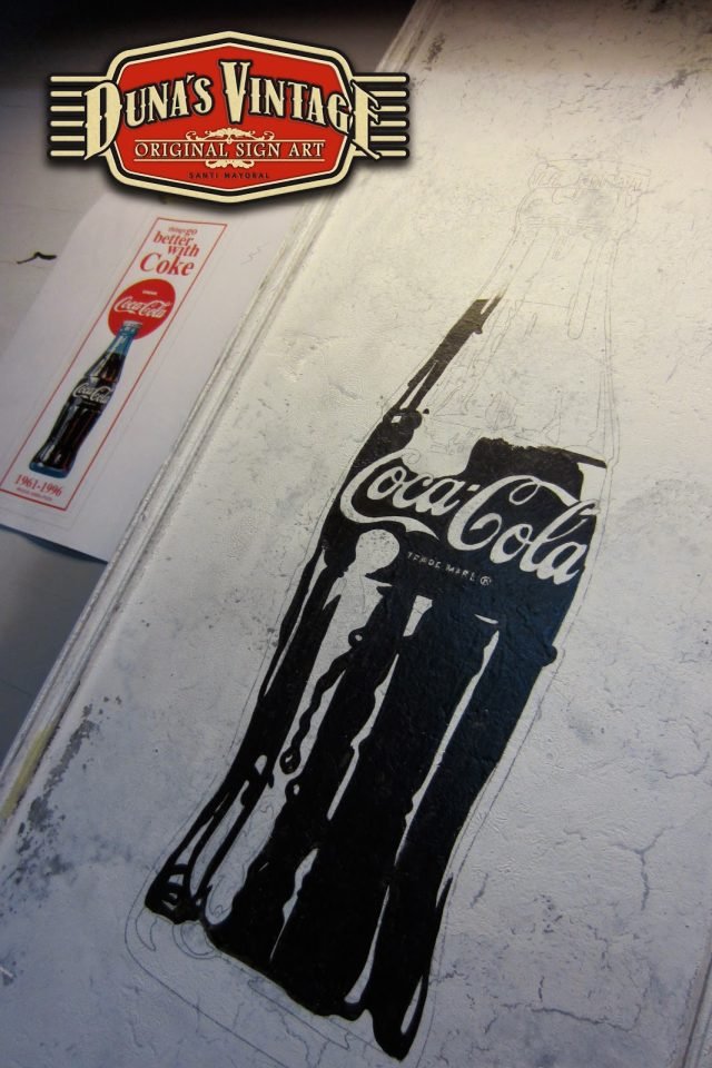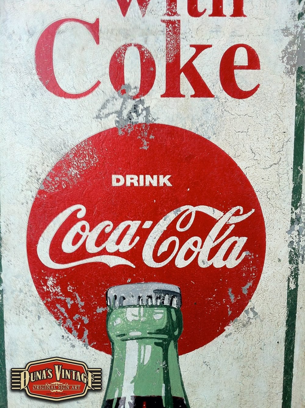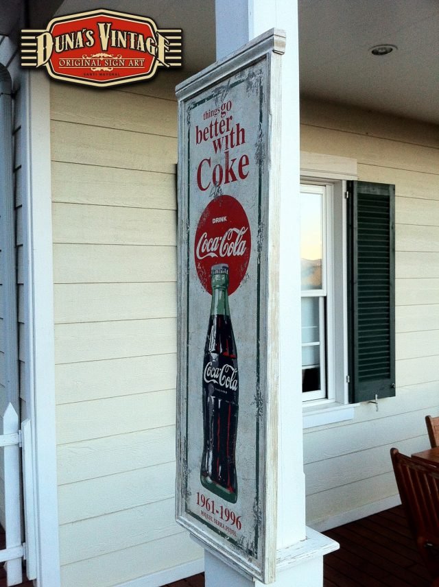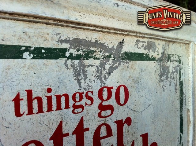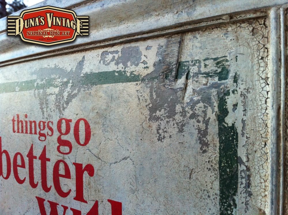 Cartel «Things go better with Coke».Tamaño 1100x365mm. Este cartel esta tratado con el efecto Retro que Duna´s Vintage emplea en sus carteles pintados a mano. (Hay algunos carteles que se han vendido pero se pueden hacer otros iguales o personalizados con el texto que se quiera). Duna´s Vintage.