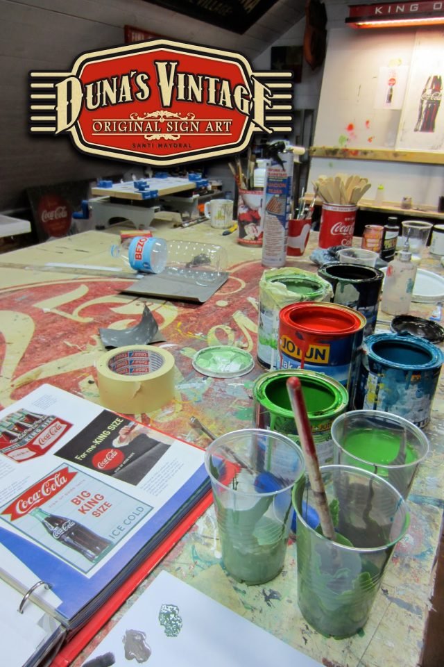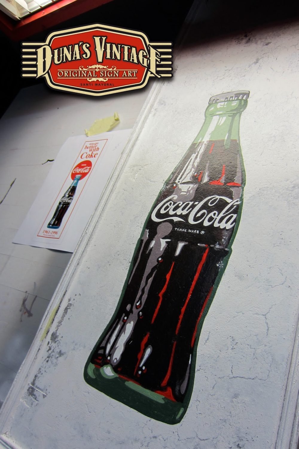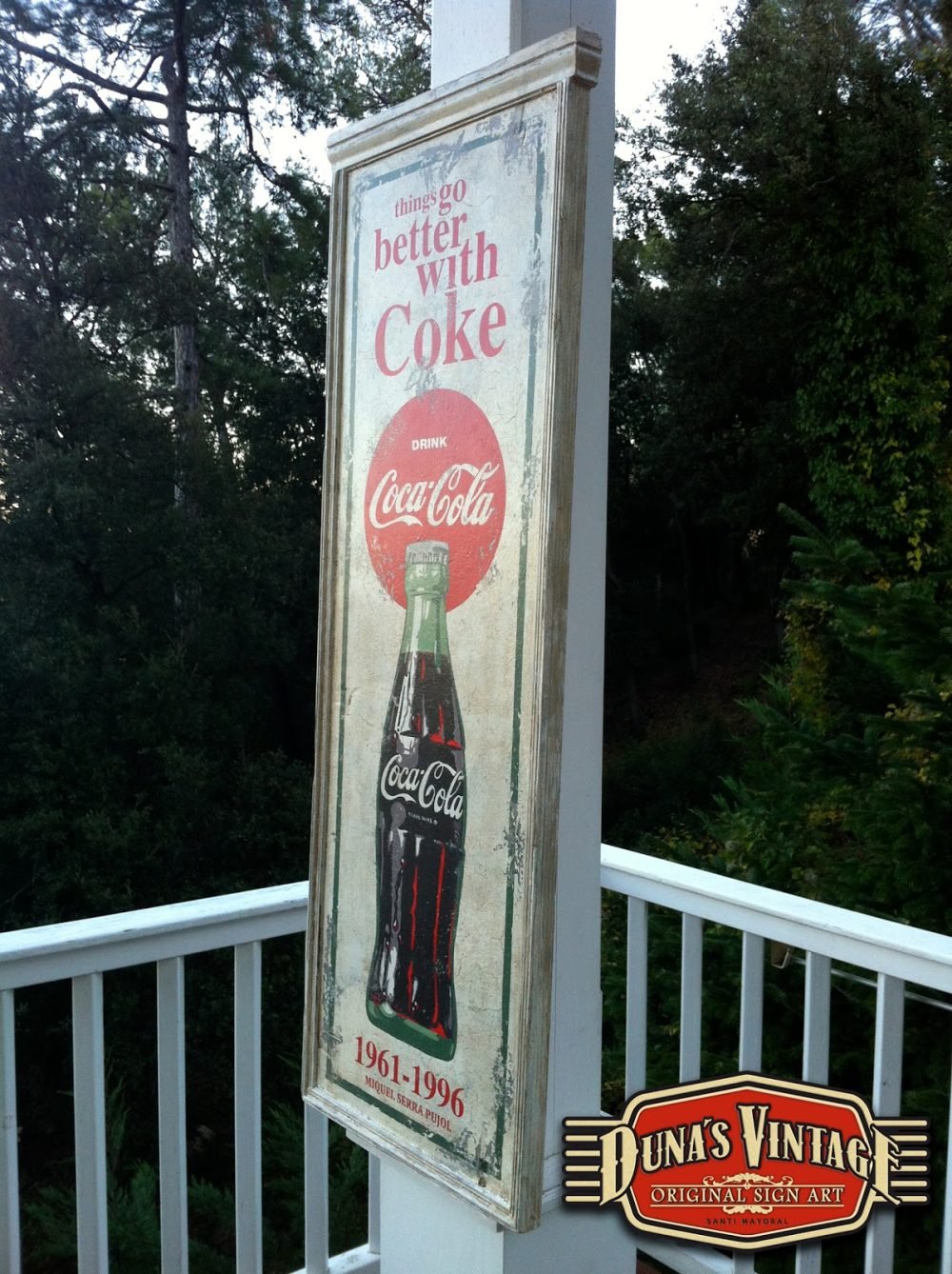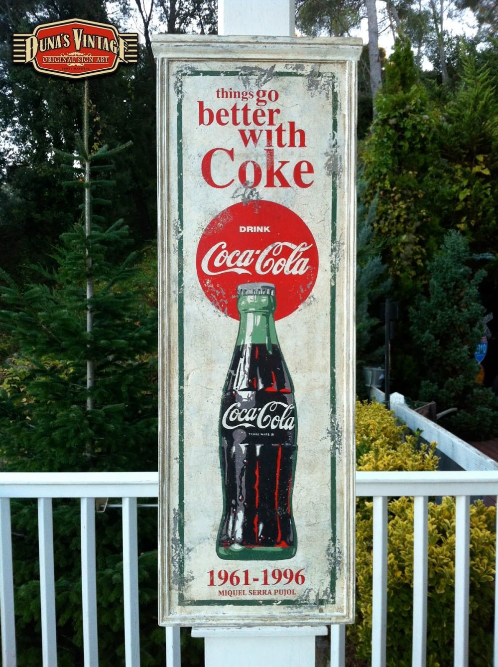 Cartel «Things go better with Coke».Tamaño 1100x365mm. Este cartel esta tratado con el efecto Retro que Duna´s Vintage emplea en sus carteles pintados a mano. (Hay algunos carteles que se han vendido pero se pueden hacer otros iguales o personalizados con el texto que se quiera). Duna´s Vintage.