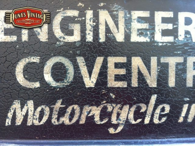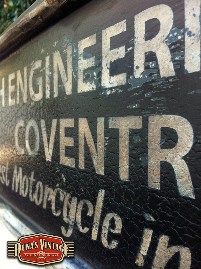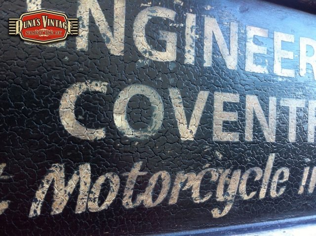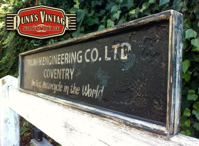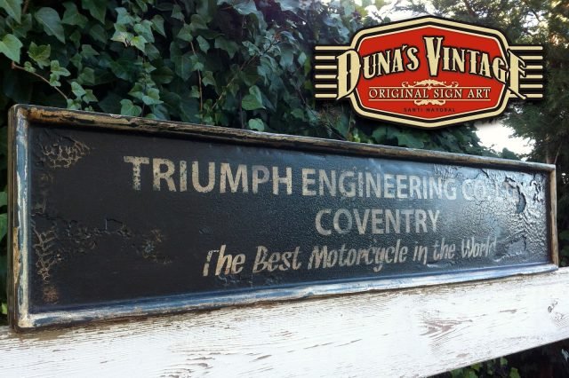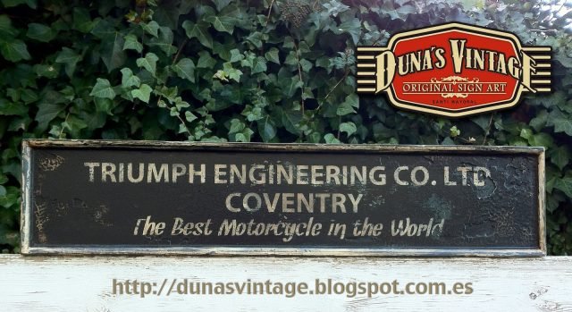 Cartel «TRIUMPH ENGINNERING Co».Tamaño 1000x220mm. Este cartel esta tratado con el efecto Retro que Duna´s Vintage emplea en sus carteles pintados a mano. (Hay algunos carteles que se han vendido pero se pueden hacer otros iguales o personalizados con el texto que se quiera).