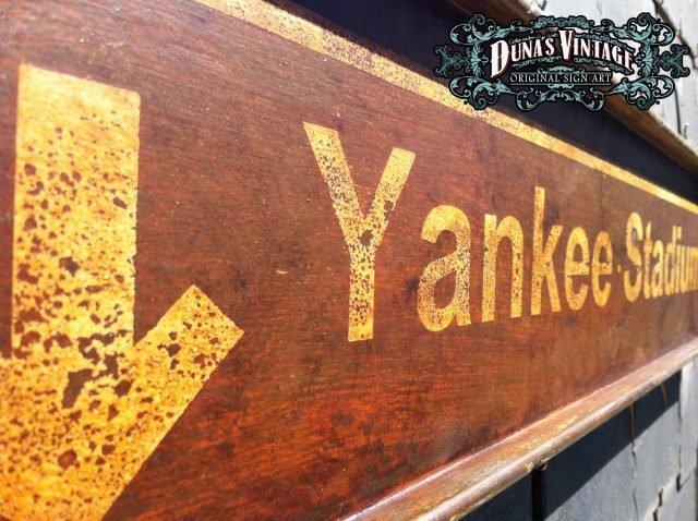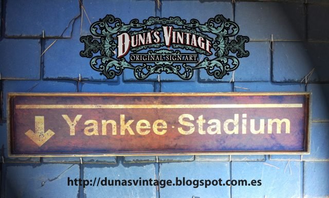 Cartel «Yankee Stadium Oxid.» Este tipo de carteles se encontraban en las entradas de metro y zonas de acceso al estadio, tamaño 200x930mm. Este cartel esta tratado con el efecto Retro que Duna´s Vintage emplea en sus carteles pintados a mano.(Hay algunos carteles que se han vendido pero se pueden hacer otros iguales o personalizados con el texto que se quiera). Duna´s Vintage.